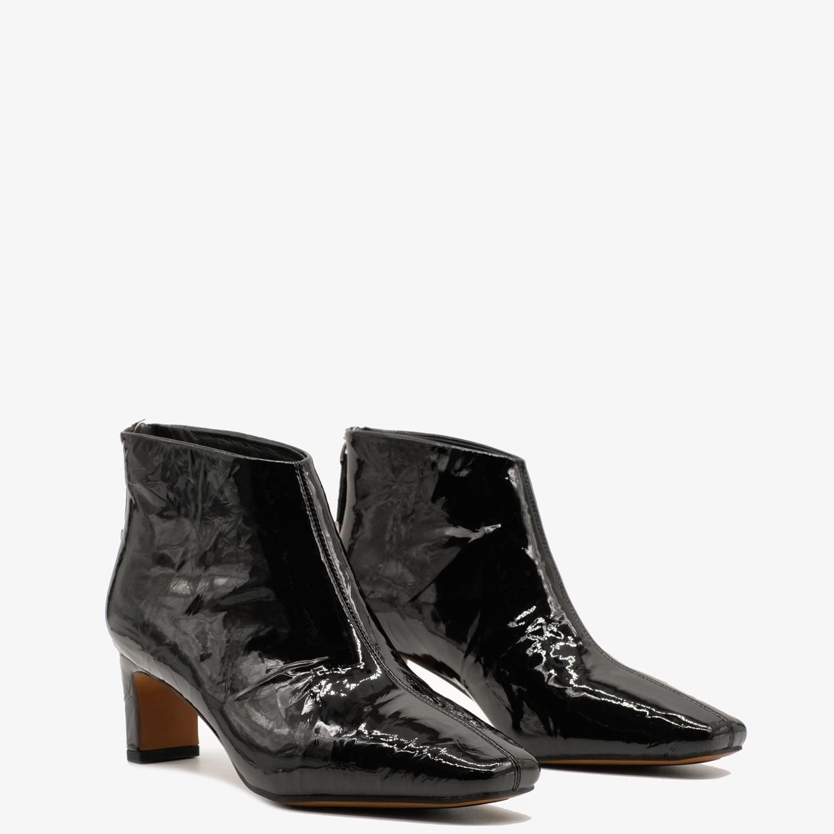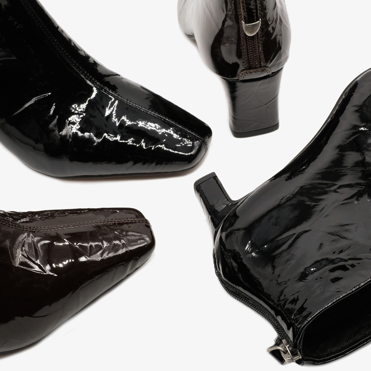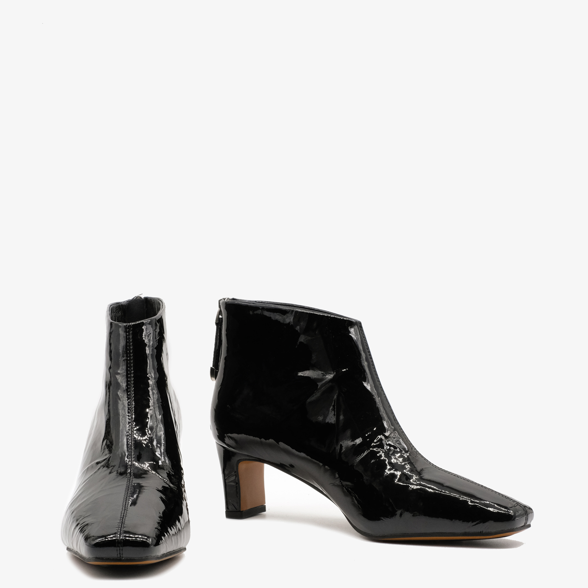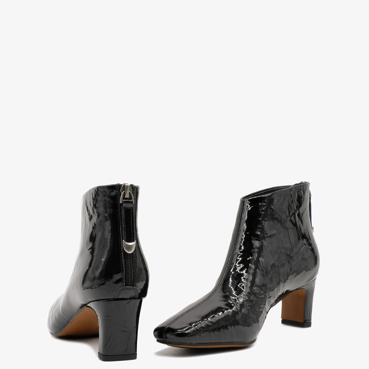 Ботильоны 10150 черного цвета изготовлены из натуральной лакированной кожи, что придает им элегантный и современный вид. Устойчивый каблук (каблук обтянут натуральной лакированной кожей) и квадратный мыс обеспечивают не только стильный внешний вид, но и комфорт при носке. Молния в пяточной части делает обувь удобной для быстрого и легкого надевания.