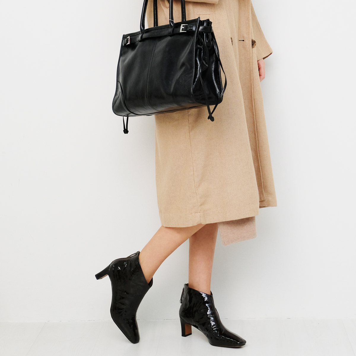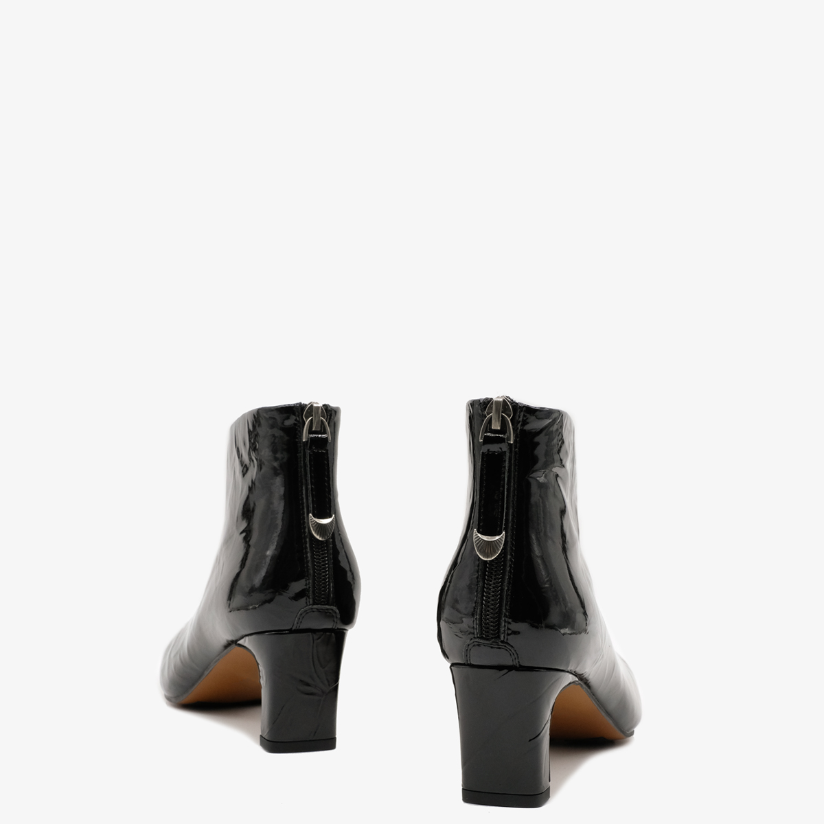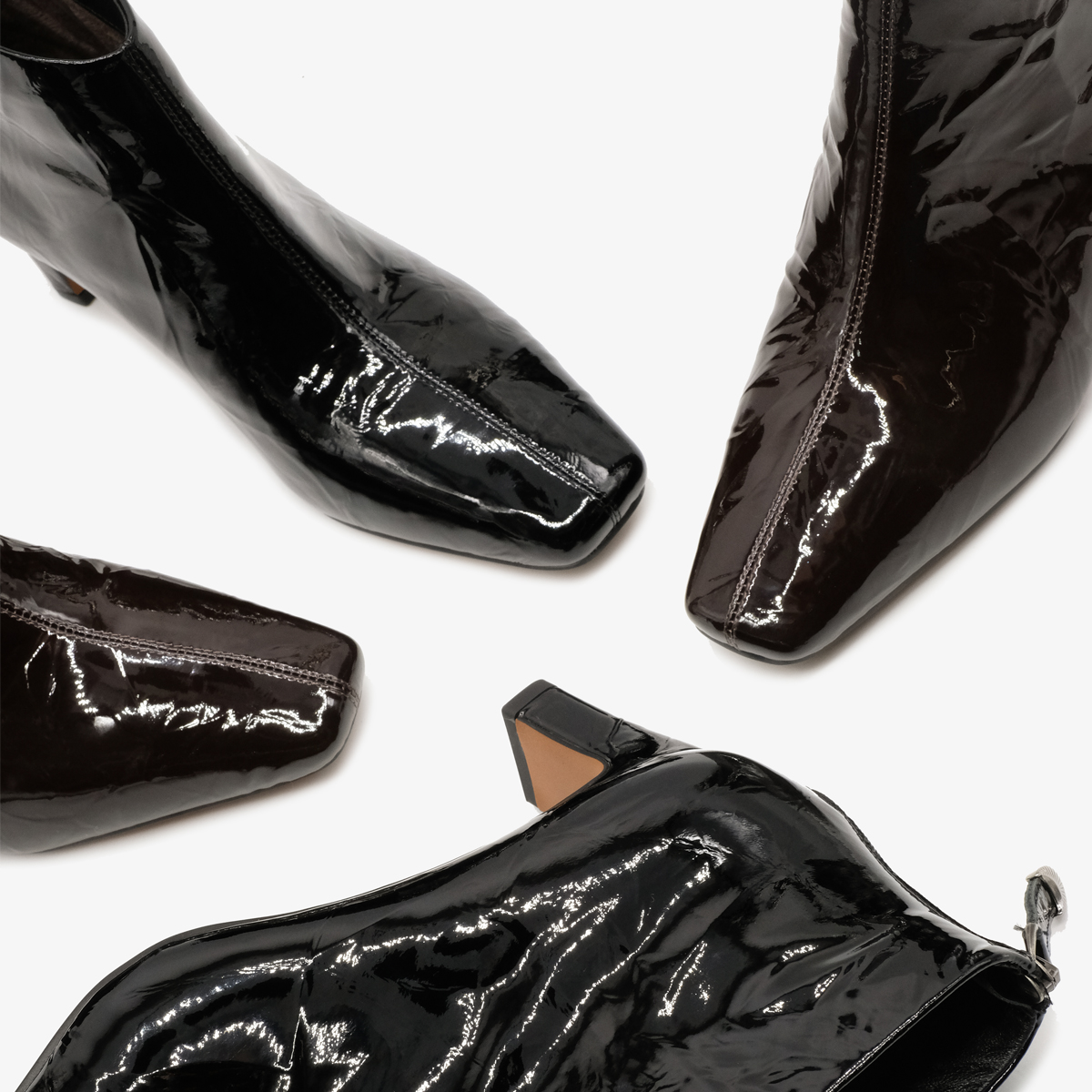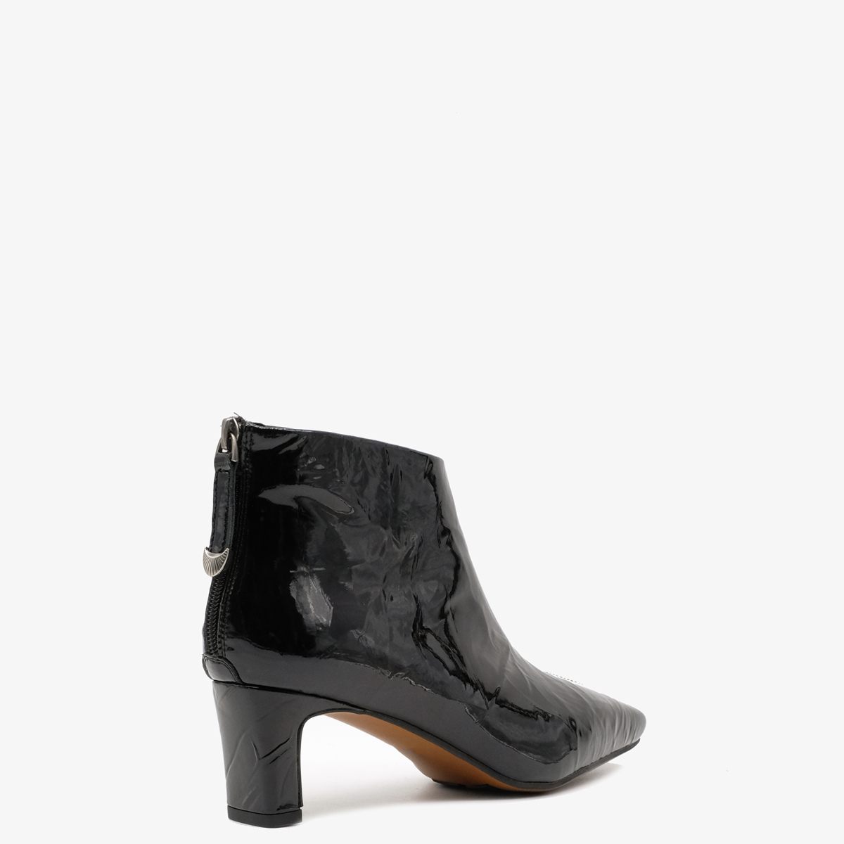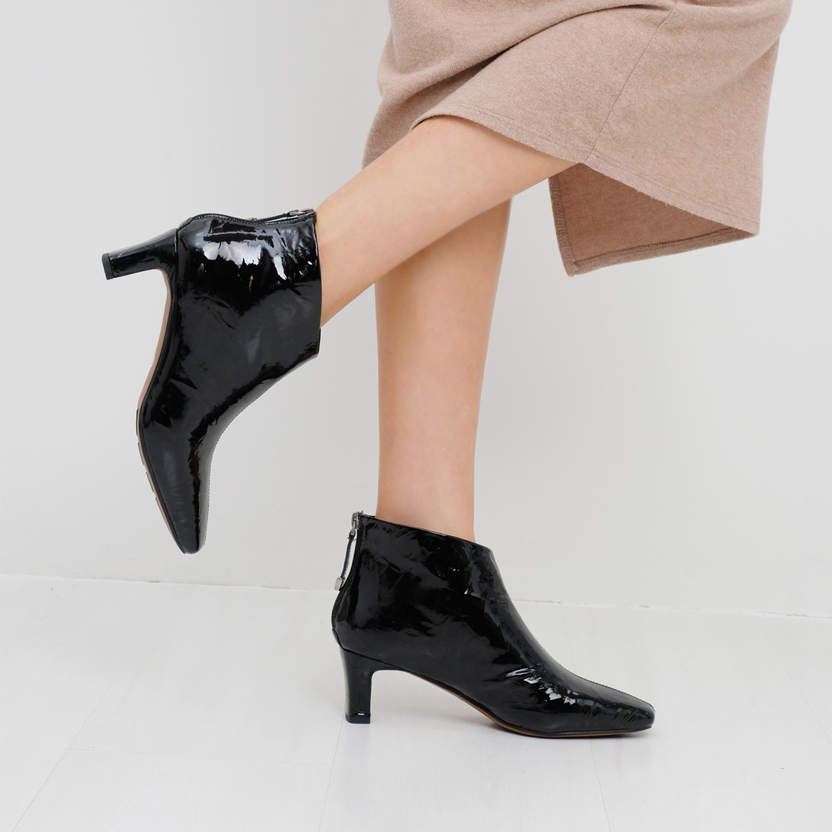 Ботильоны 10150 черного цвета изготовлены из натуральной лакированной кожи, что придает им элегантный и современный вид. Устойчивый каблук (каблук обтянут натуральной лакированной кожей) и квадратный мыс обеспечивают не только стильный внешний вид, но и комфорт при носке. Молния в пяточной части делает обувь удобной для быстрого и легкого надевания.