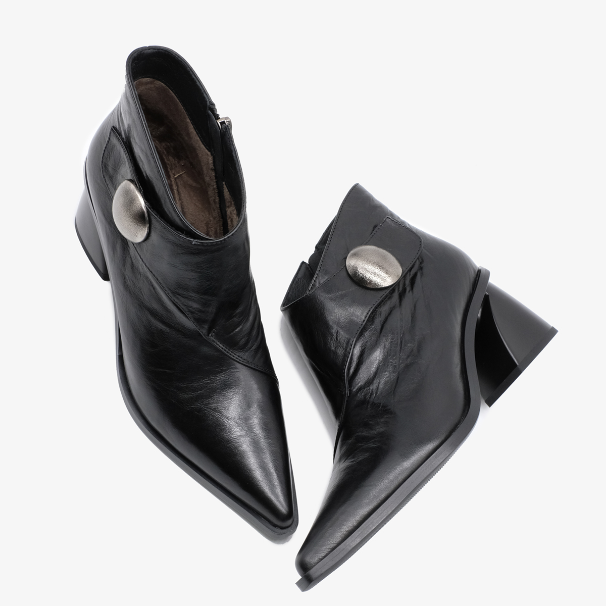 Ботильоны 10786 черного цвета изготовлены из натуральной кожи. Устойчивый каблук и острый мыс обеспечивают элегантный внешний вид. Молния с внутренней стороны и ремешок с липучкой делают обувь удобной в использовании и позволяют легко регулировать посадку. Металлический декор добавляет изысканности и уникальности паре.