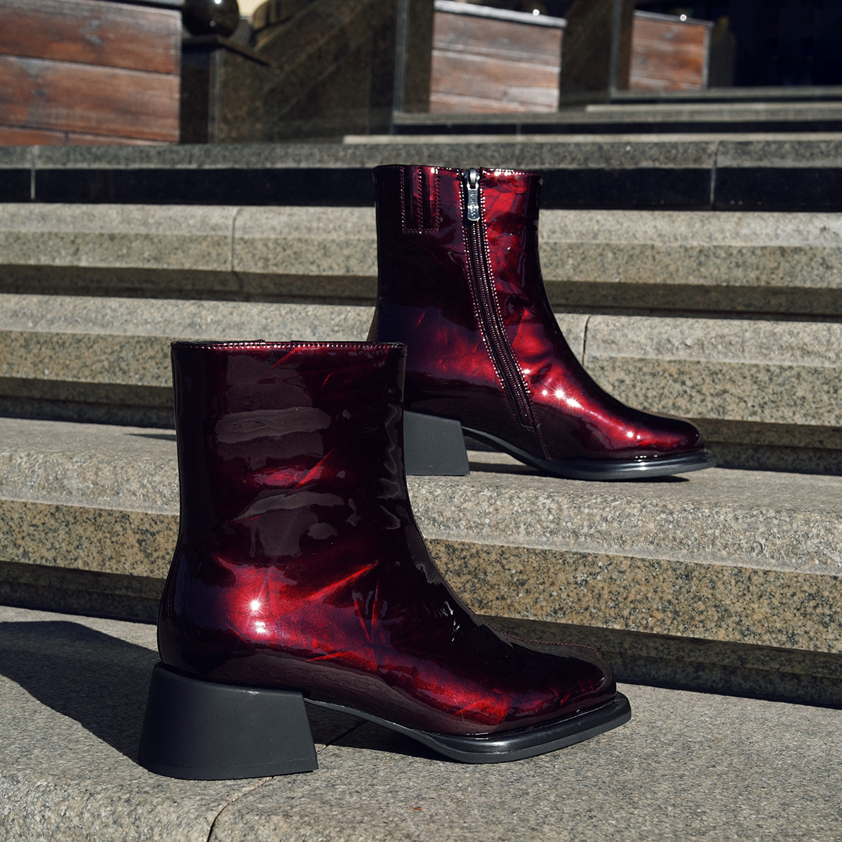 Бордовые ботильоны 10850 из натуральной лакированной кожи — это стильный выбор для Вашей обувной коллекции. Эти ботильоны оснащены устойчивым каблуком и закргуленным мысом, что придает им утонченный вид. Молния с внутренней стороны облегчает процесс обувания.