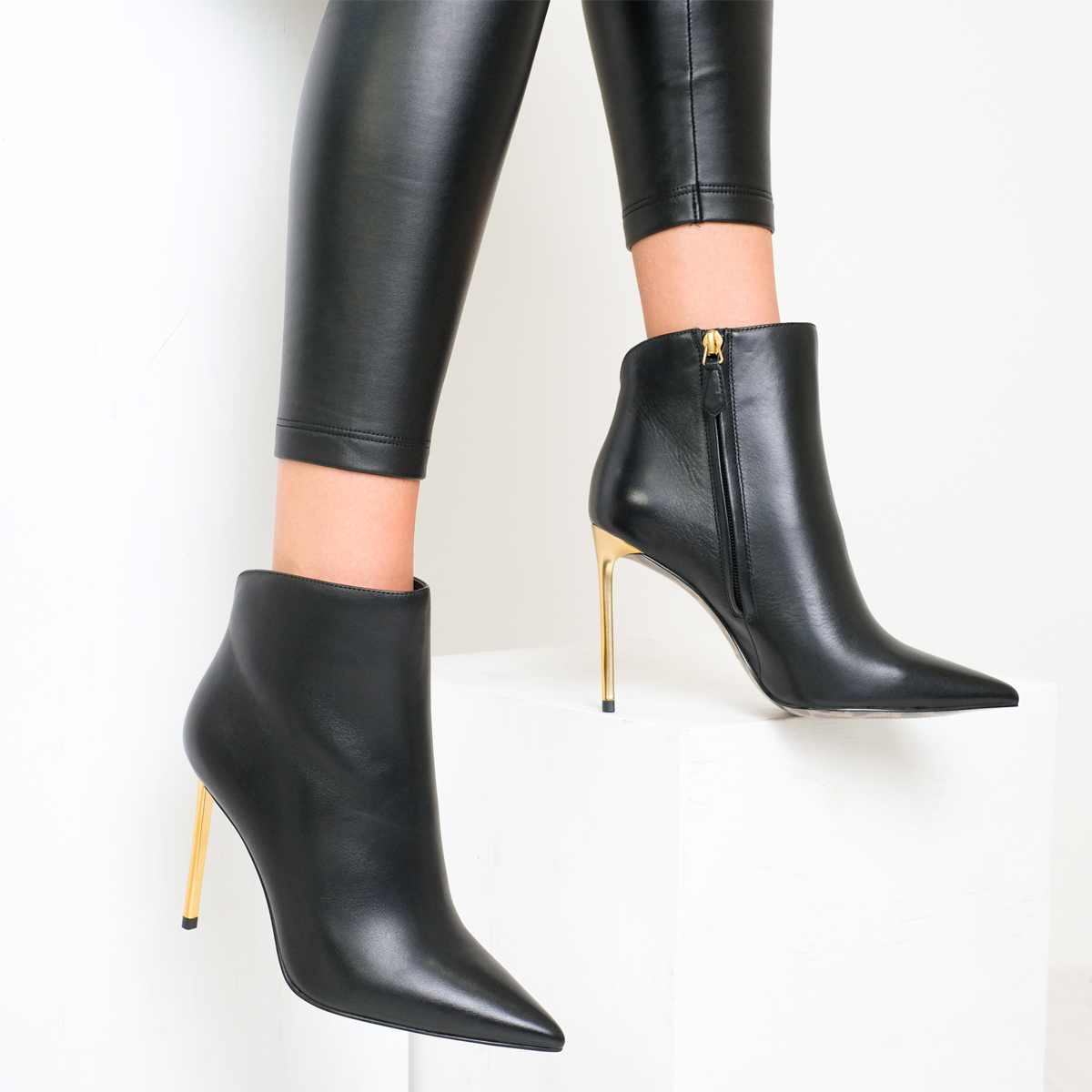 Ботильоны 9942 черного цвета, выполненные из натуральной кожи, идеально подойдут для создания элегантного образа. Устойчивый золотой каблук-шпилька и острый мыс придают обуви шикарный вид, а молния с внутренней стороны обеспечивает удобство при надевании и снятии.