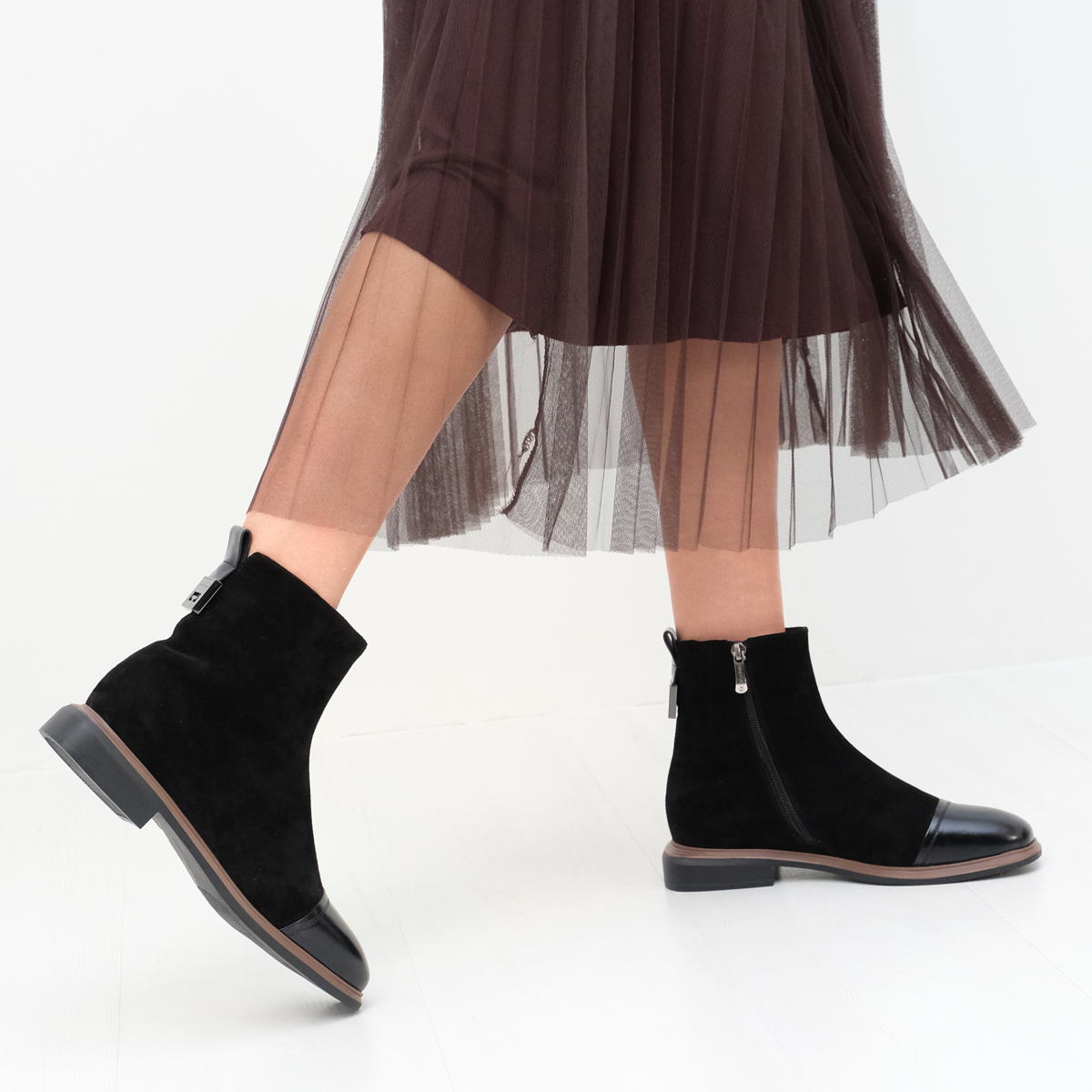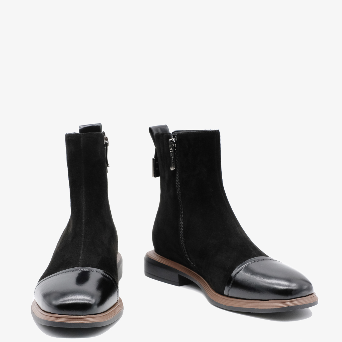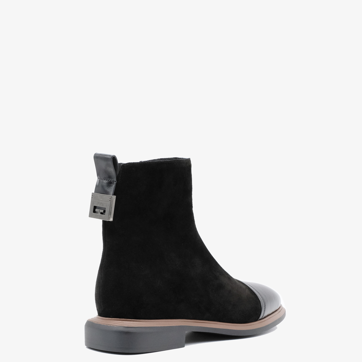 Ботинки 10108 выполнены из натуральной замши и натуральной кожи черного цвета, что придаёт им элегантный и современный вид. Ботинки оснащены широким каблуком и закругленным мысом, что обеспечивает отличную устойчивость и комфорт при ходьбе. Молния с внутренней стороны делает их удобными в носке, а металлический декор сзади добавляет изюминку и стильный акцент.