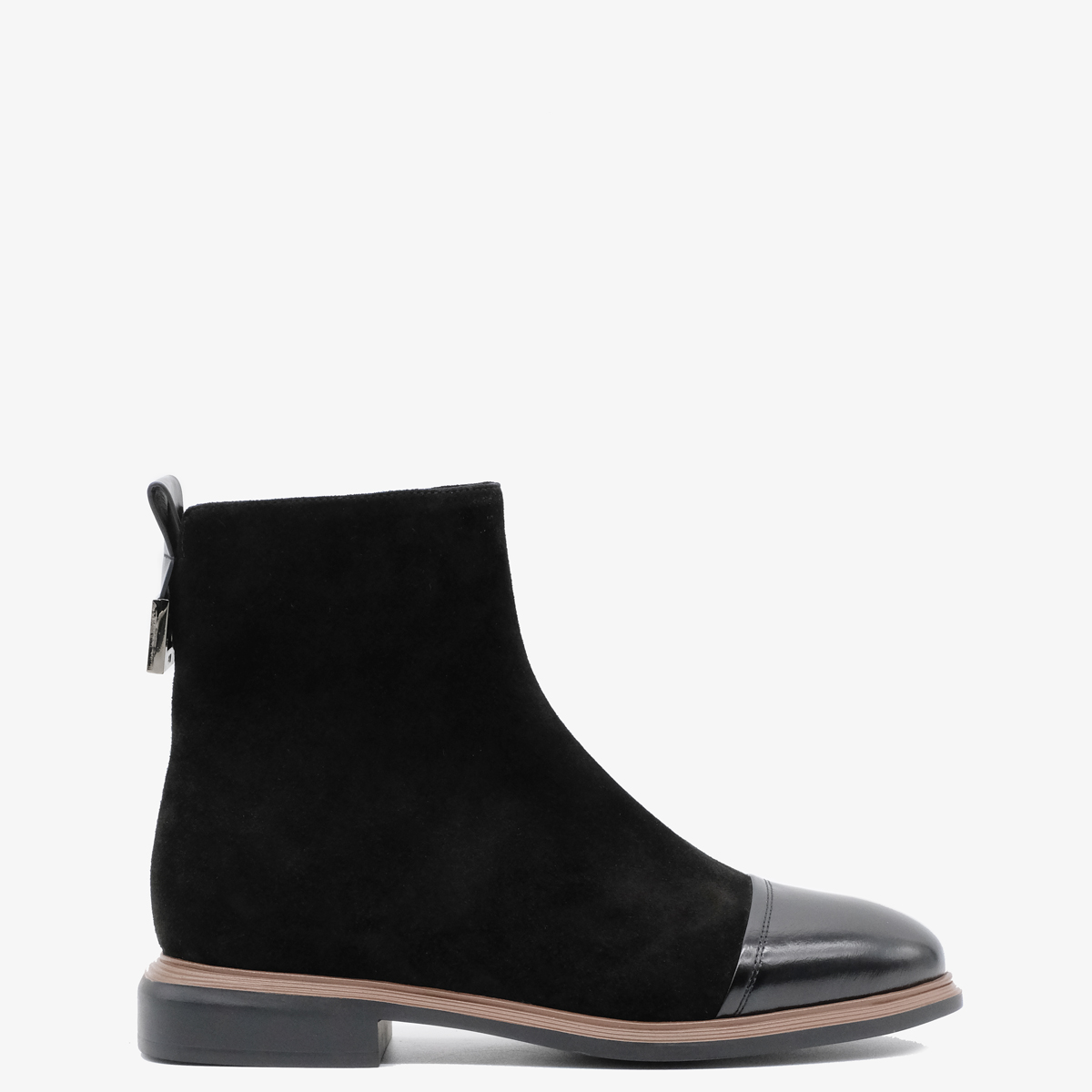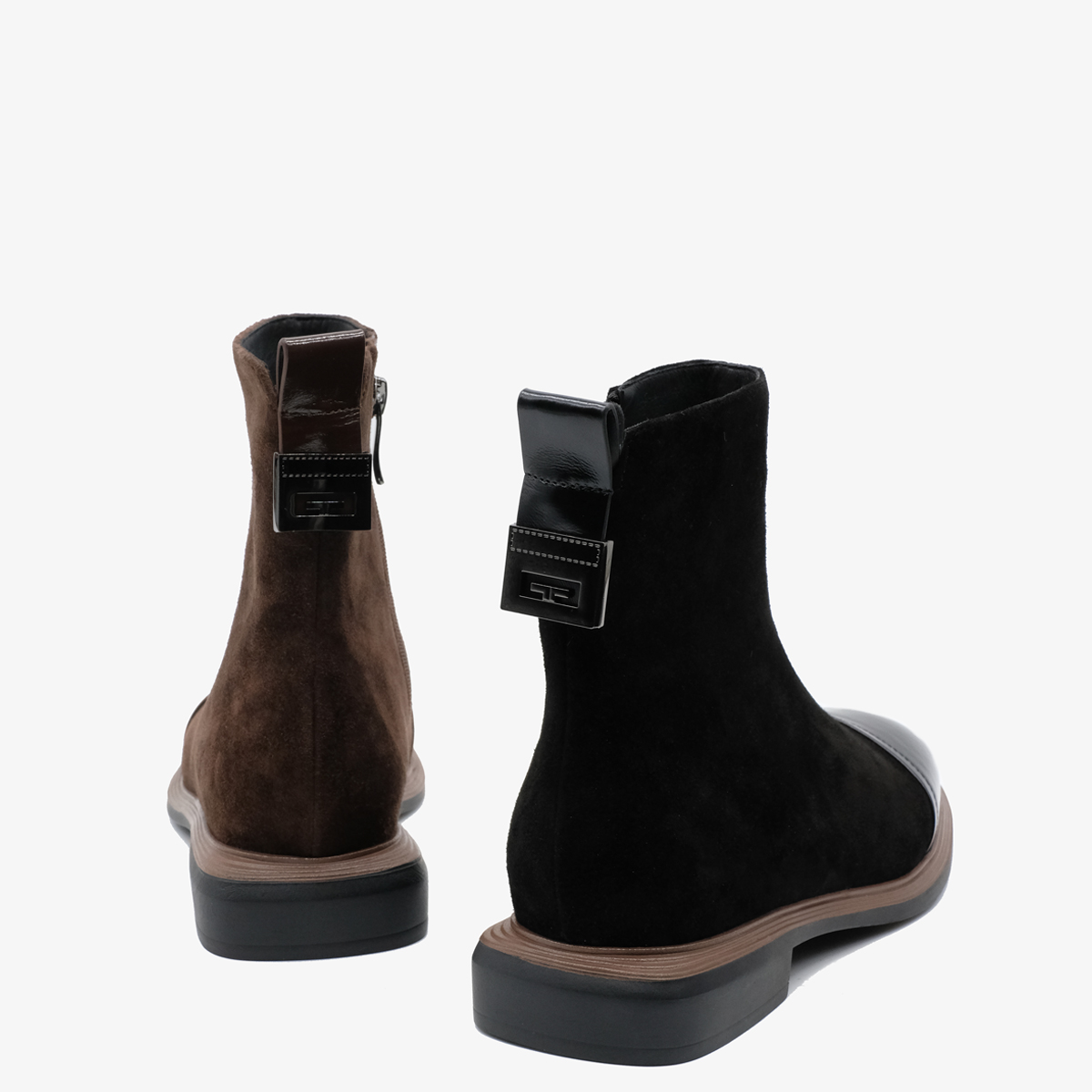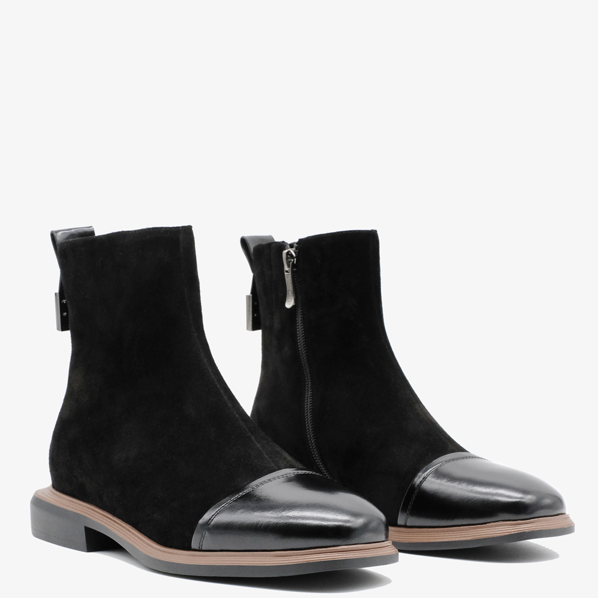 Ботинки 10108 выполнены из натуральной замши и натуральной кожи черного цвета, что придаёт им элегантный и современный вид. Ботинки оснащены широким каблуком и закругленным мысом, что обеспечивает отличную устойчивость и комфорт при ходьбе. Молния с внутренней стороны делает их удобными в носке, а металлический декор сзади добавляет изюминку и стильный акцент.