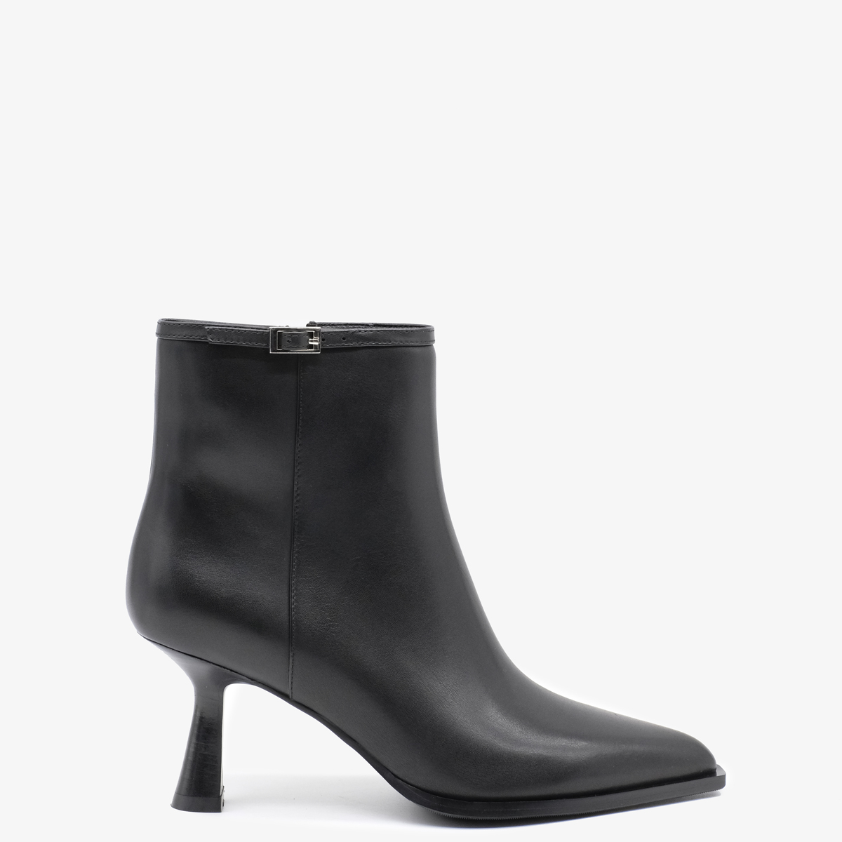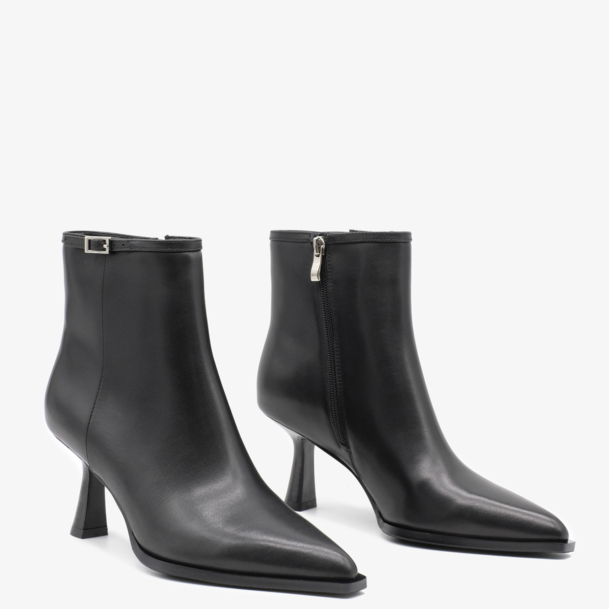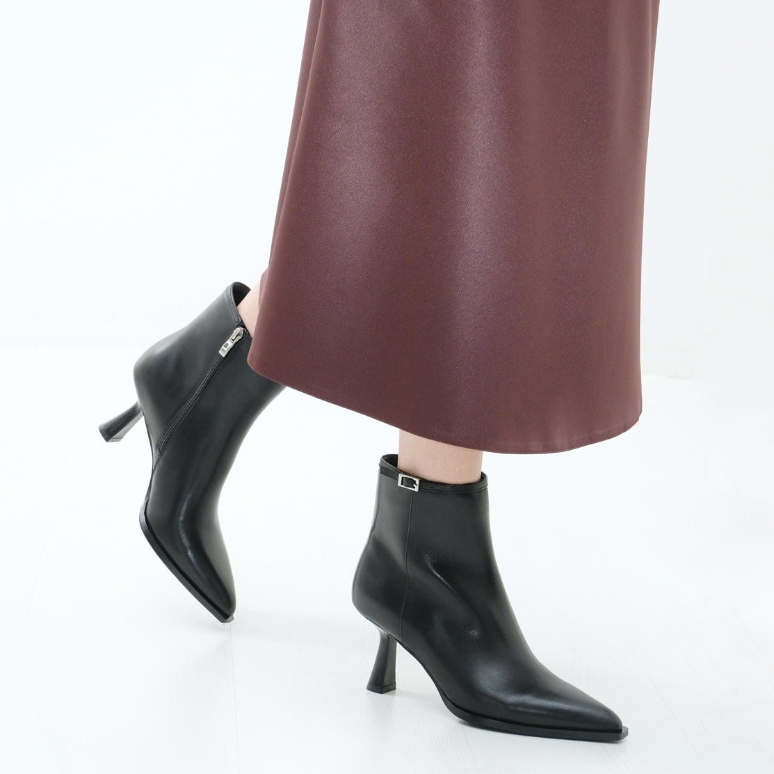 Ботильоны 10971 черного цвета выполнены из натуральной кожи, что придает им элегантный и современный вид. Устойчивый каблук и острый мыс обеспечивают не только стильный внешний вид, но и комфорт при длительном ношении. Молния с внутренней стороны позволяет легко обуваться, а декор в виде тонкого ремешка с пряжкой добавляет изысканности.