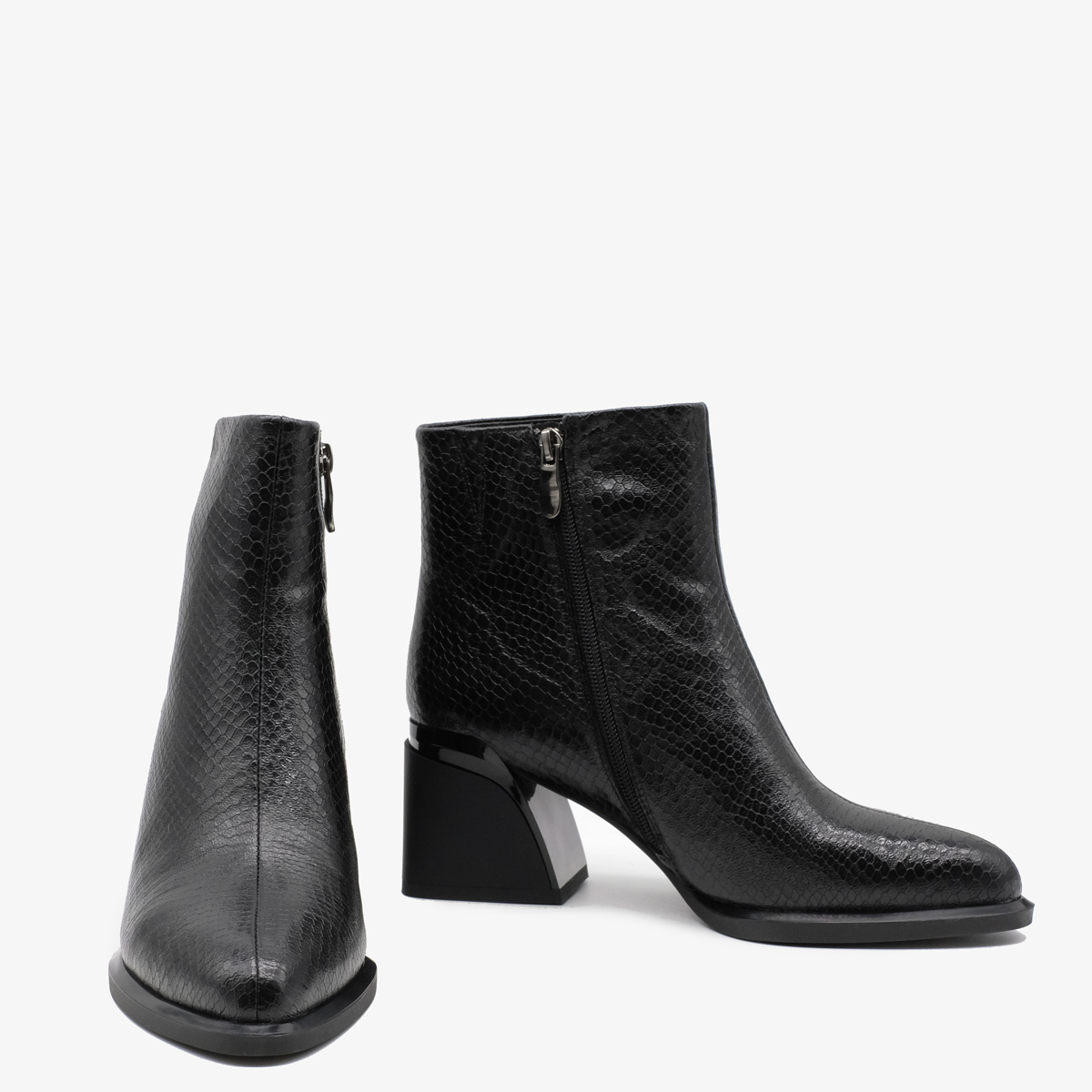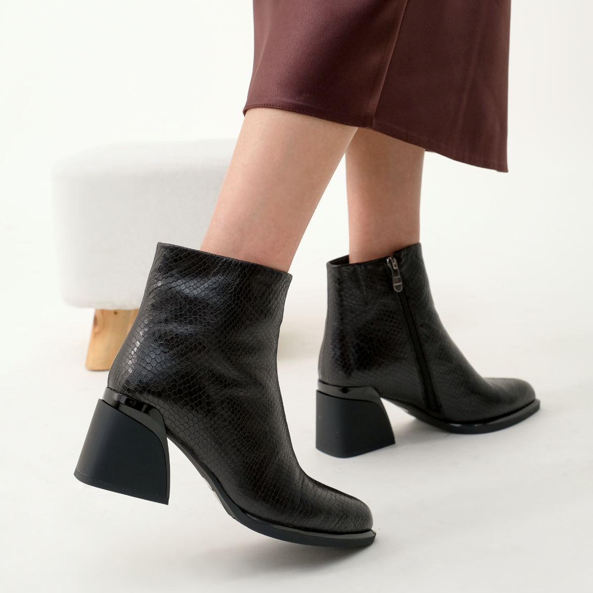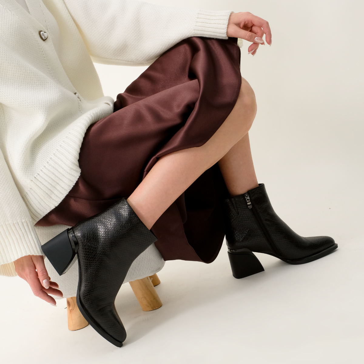 Черные ботильоны 10987 выполнены из натуральной кожи, что обеспечивает элегантный внешний вид. Широкий каблук и острый мыс делают эти ботильоны идеальными для создания как повседневных, так и вечерних образов. Декор на каблуке и фактура под рептилию добавляют нотку изысканности.
