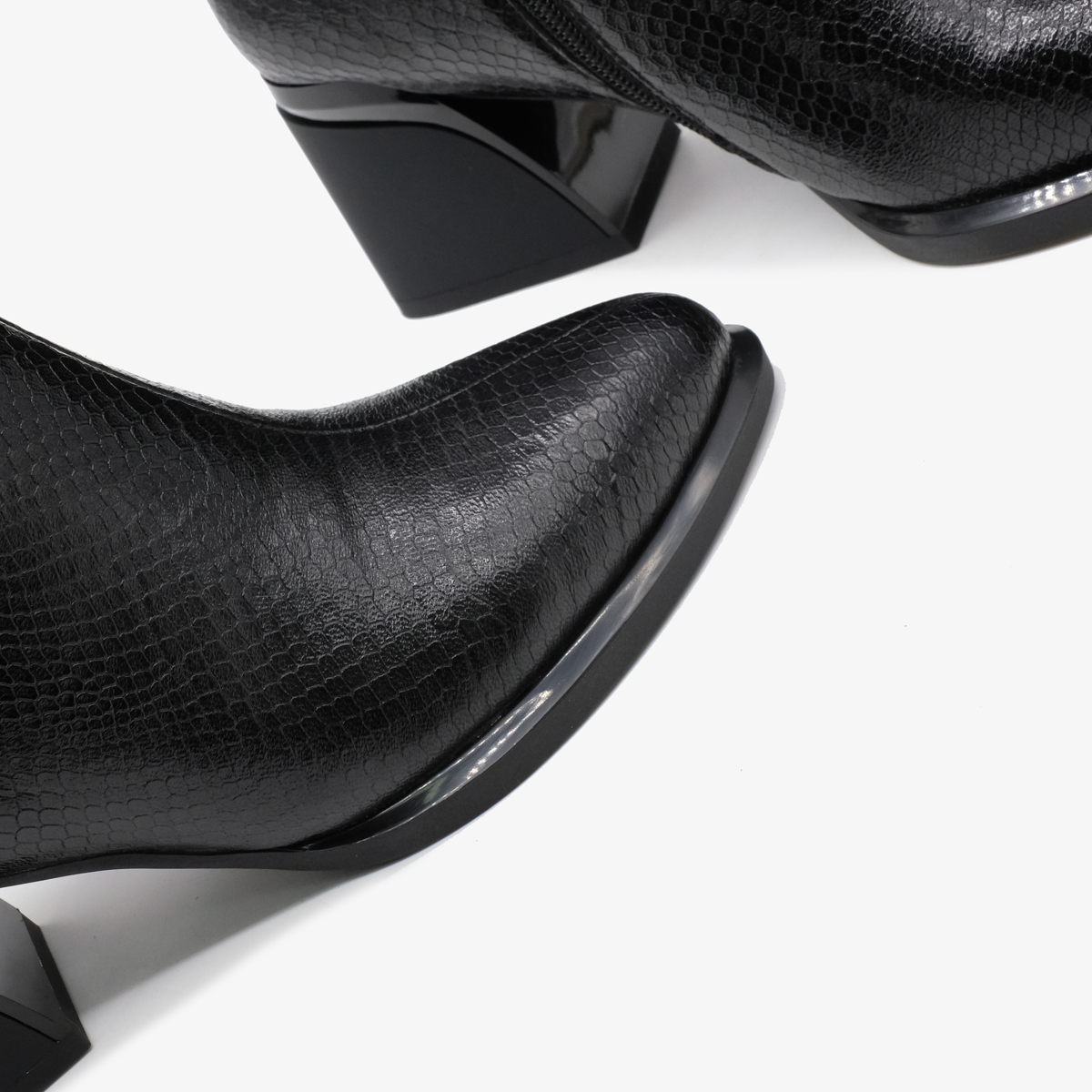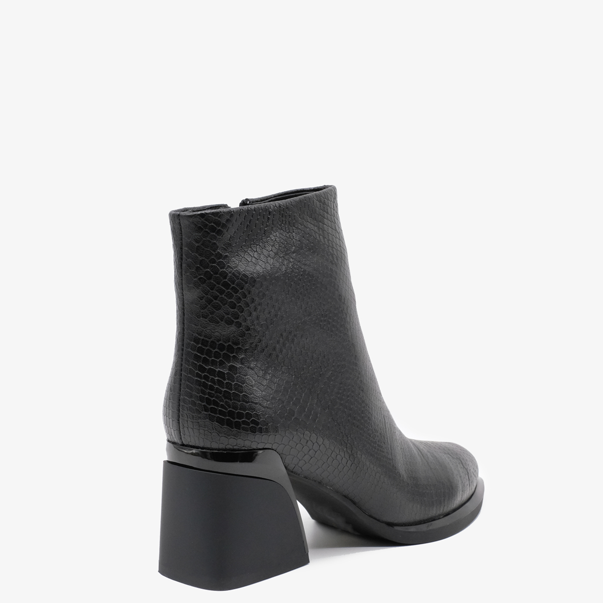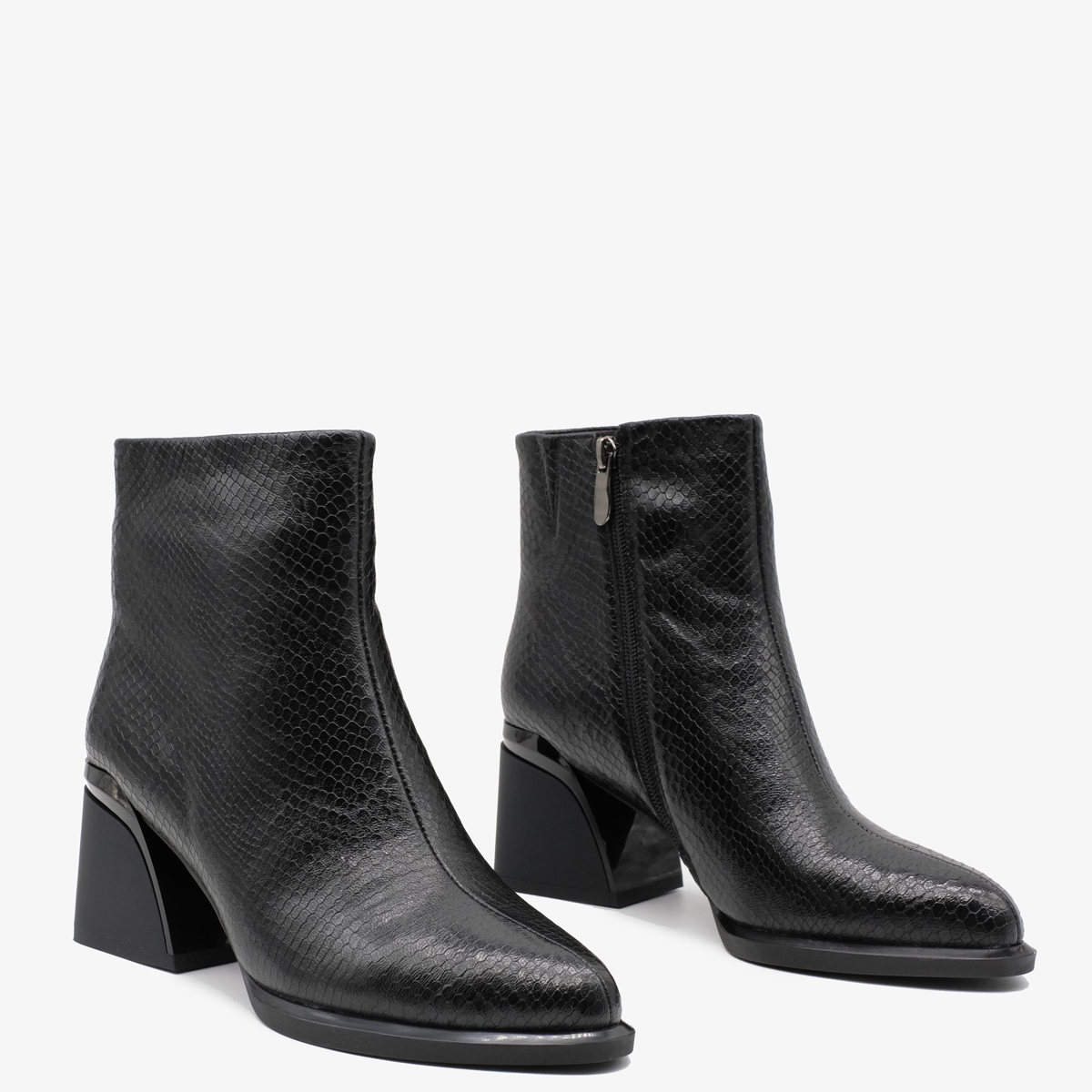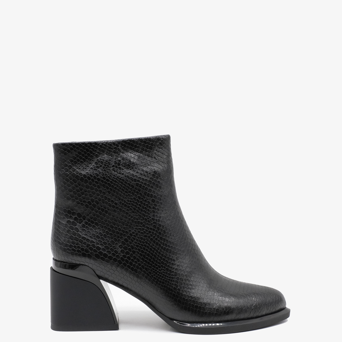 Черные ботильоны 10987 выполнены из натуральной кожи, что обеспечивает элегантный внешний вид. Широкий каблук и острый мыс делают эти ботильоны идеальными для создания как повседневных, так и вечерних образов. Декор на каблуке и фактура под рептилию добавляют нотку изысканности.