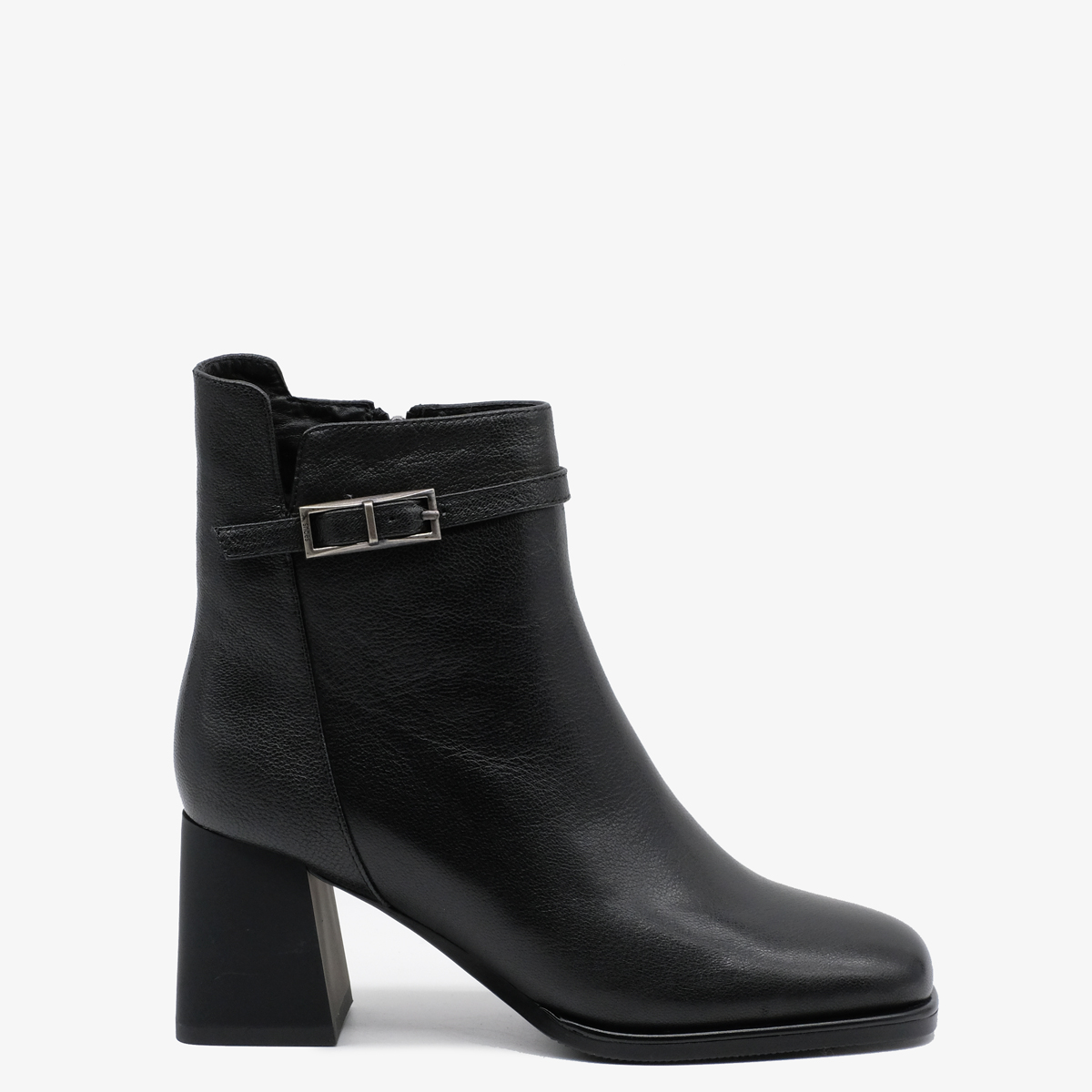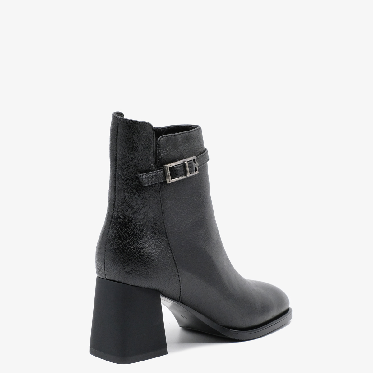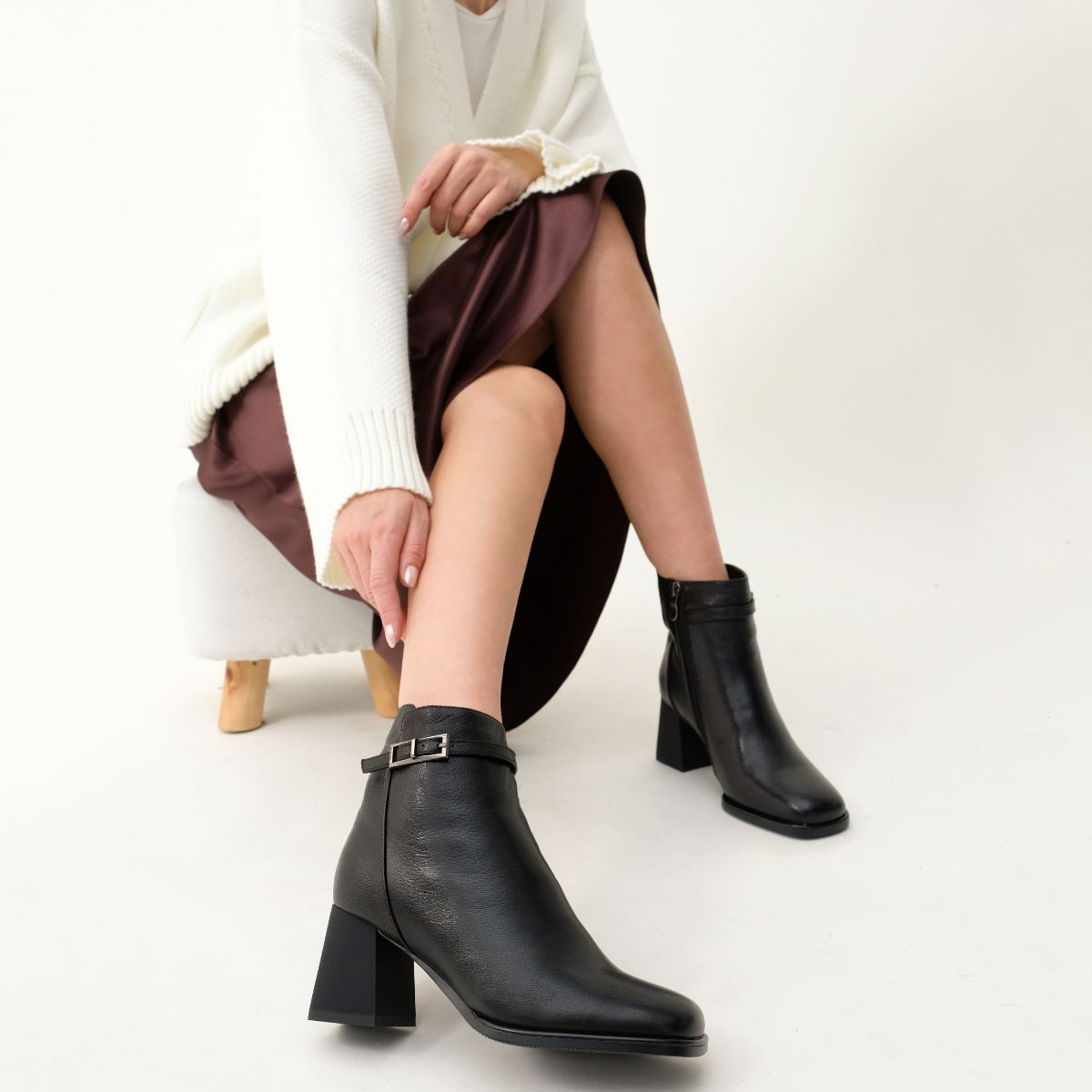 Ботильоны 10988 черного цвета выполнены из натуральной кожи, что гарантирует их долговечность и элегантный внешний вид. Устойчивый каблук и квадратный мыс обеспечивают комфорт при ношении, а молния с внутренней стороны делает обувь легкой в использовании. Декор в виде ремешка с пряжкой добавляет изысканности.