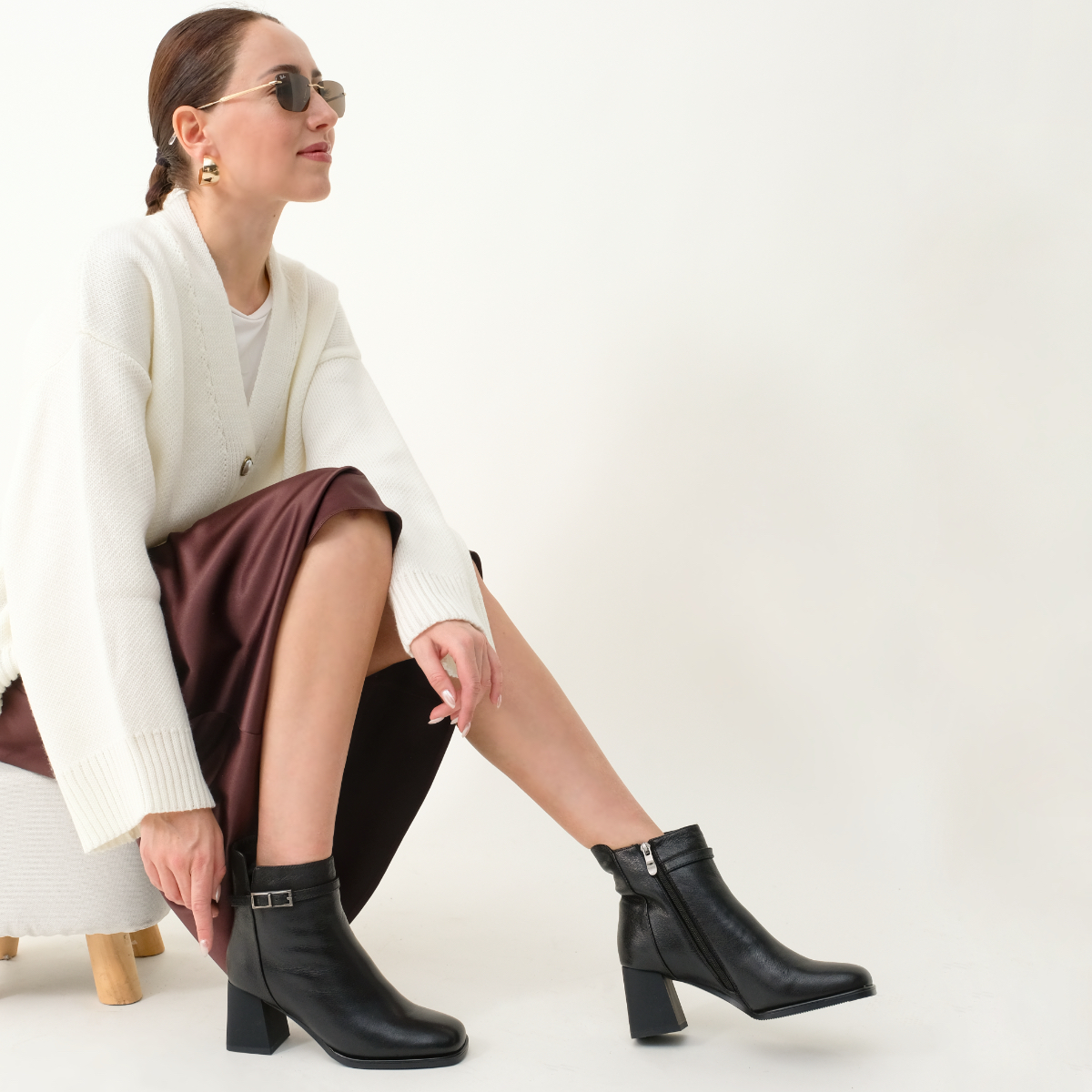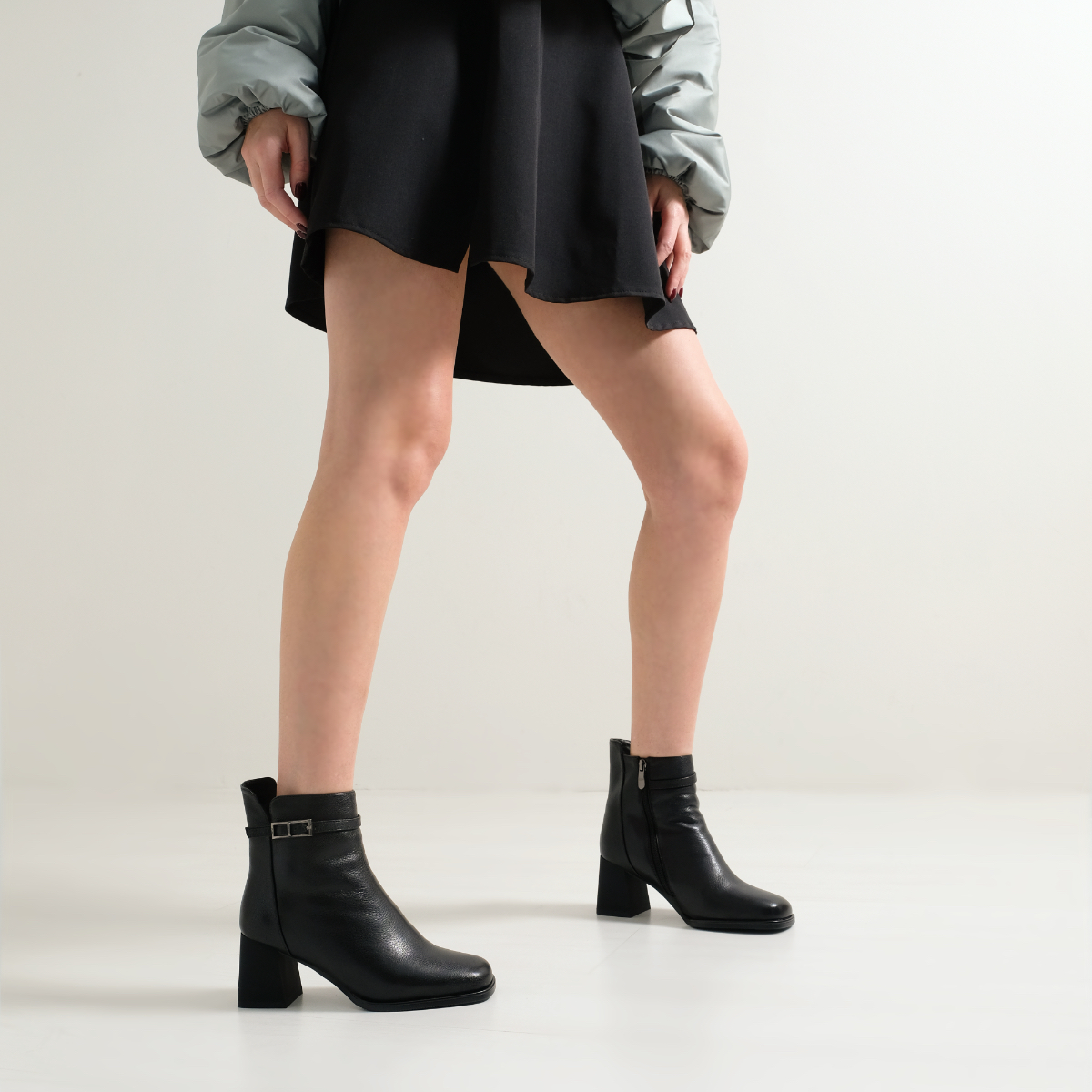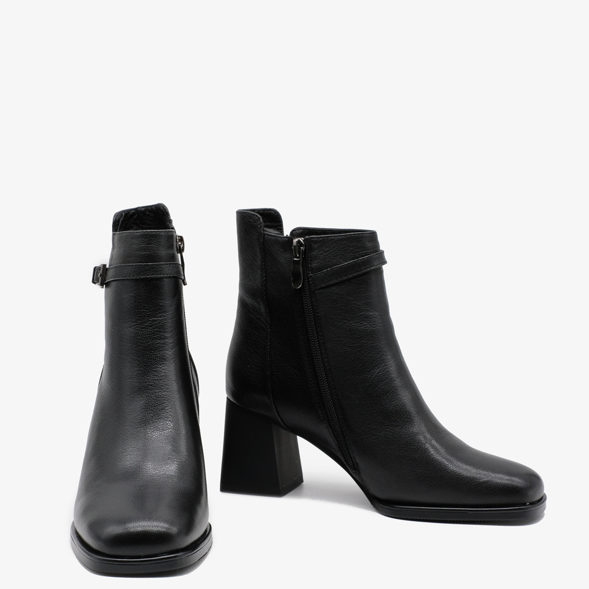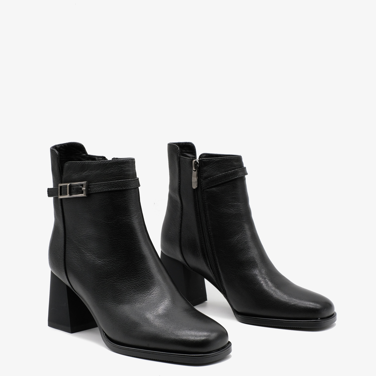 Ботильоны 10988 черного цвета выполнены из натуральной кожи, что гарантирует их долговечность и элегантный внешний вид. Устойчивый каблук и квадратный мыс обеспечивают комфорт при ношении, а молния с внутренней стороны делает обувь легкой в использовании. Декор в виде ремешка с пряжкой добавляет изысканности.