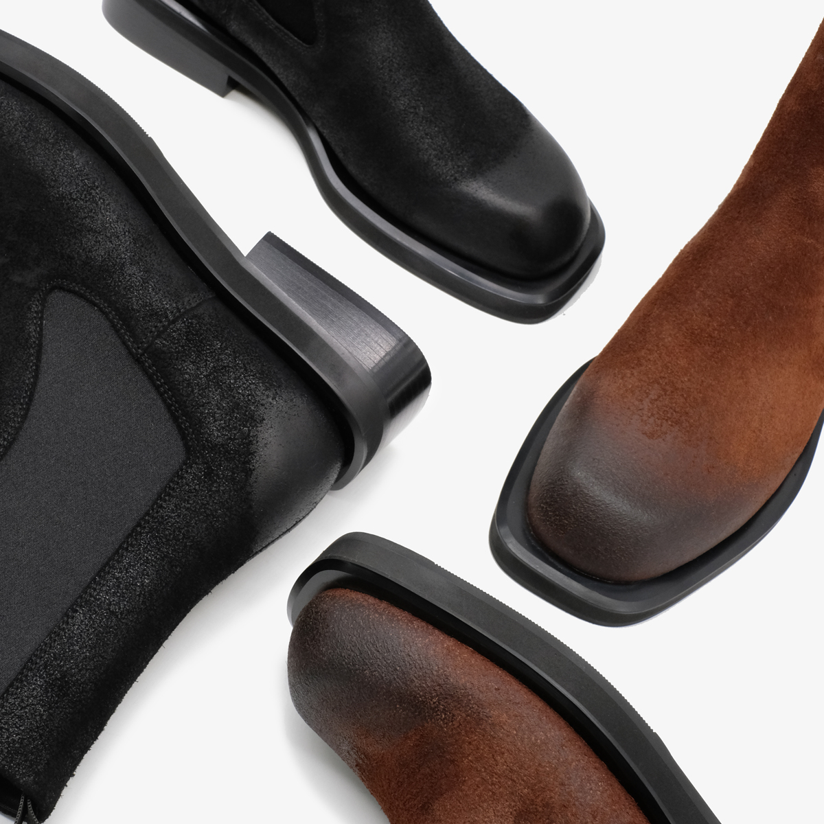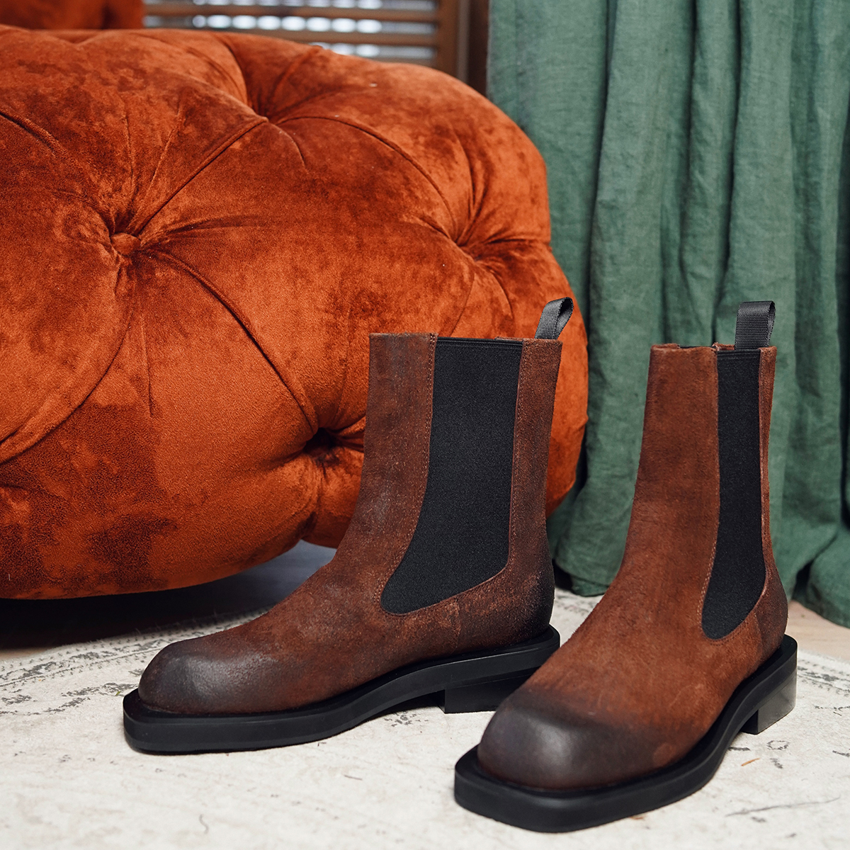 Ботинки-челси 11037 выполнены из натуральной замши (нубук) коричневого цвета, что придает им элегантный и современный вид. Широкий каблук и закругленный мыс, которые обеспечивают комфорт при ношении и стабильность при ходьбе. Эластичные вставки по бокам делают обувь удобной для надевания и снятия.