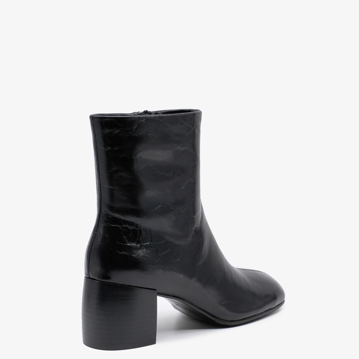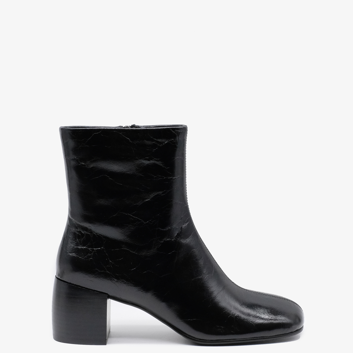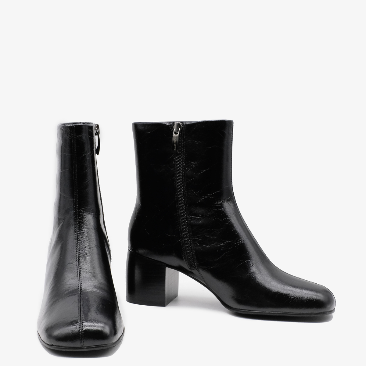 Черные ботильоны 11045, выполненные из высококачественной натуральной кожи. Квадратный мыс в сочетании с устойчивым каблуком и трендовой фактурой мятой кожи, что придает обуви современный и выразительный вид, позволяя Вам выглядеть уникально, чувствовать себя уверенно и комфортно на протяжении всего дня. Удобная молния, расположенная с внутренней стороны, значительно упрощает процесс надевания и снятия.