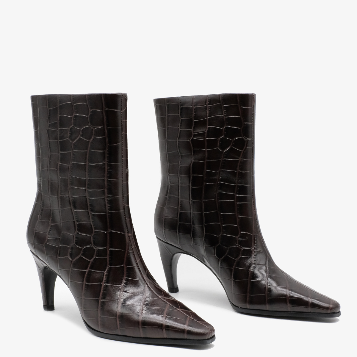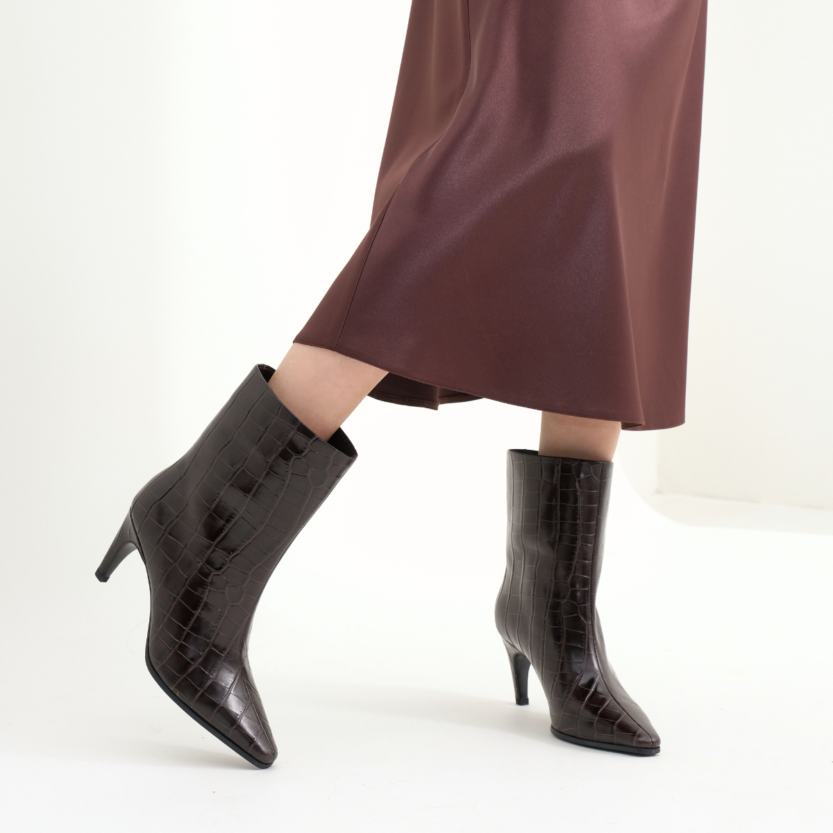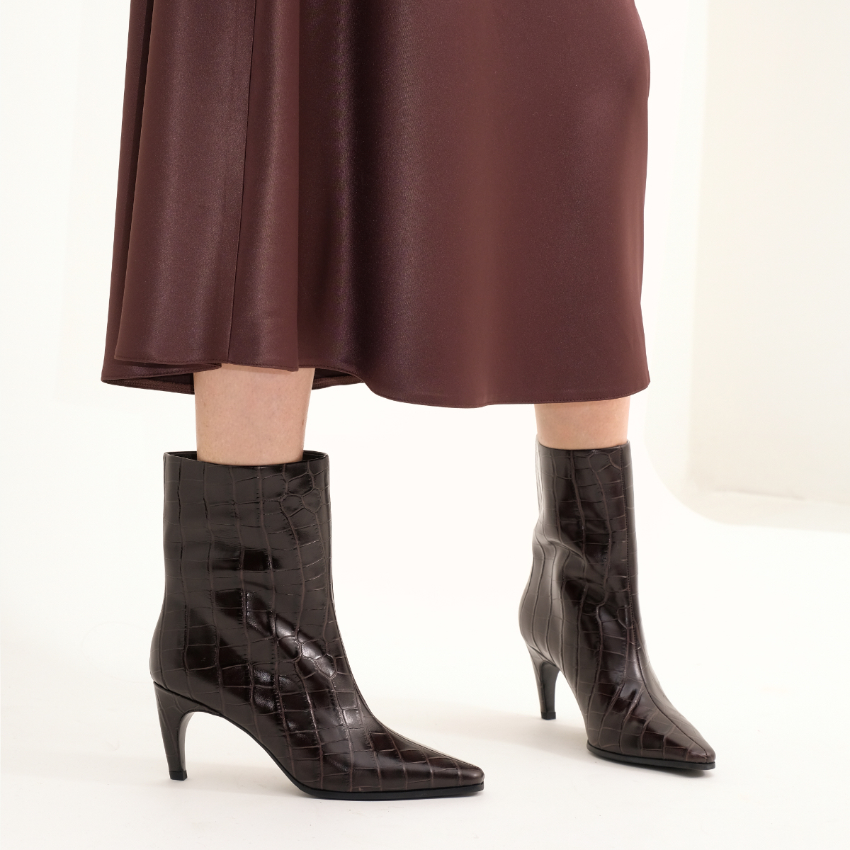 Коричневые ботильоны 11054, выполненные из высококачественной натуральной кожи, станут центральным элементом Вашего образа. Их главная особенность — это эксклюзивная фактура под рептилию в сочетании с изящным острым мысом и устойчивым каблуком, что позволяет создать по-настоящему смелый и уникальный образ. Модель без молнии создает элегантный силуэт, обеспечивая легкое надевание.