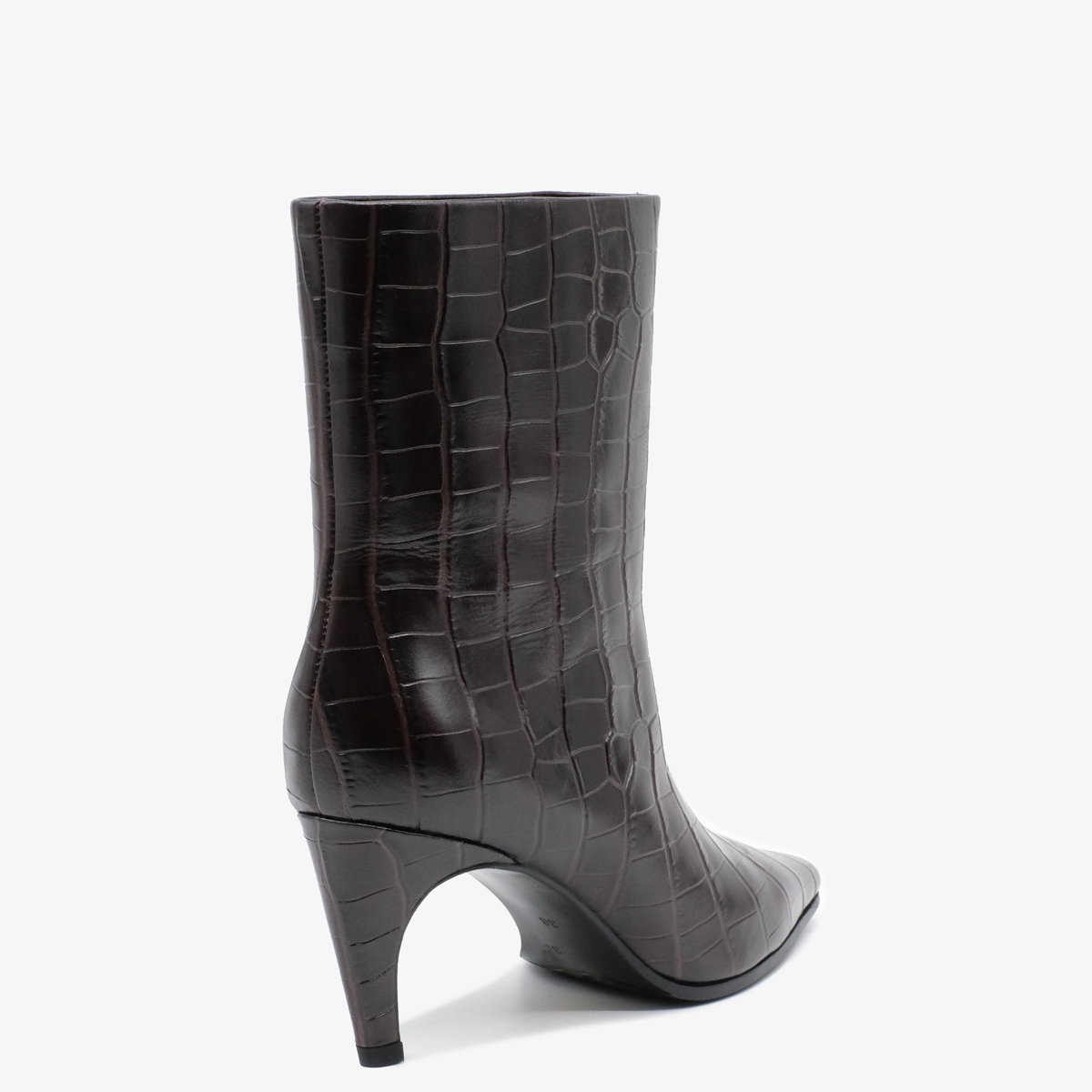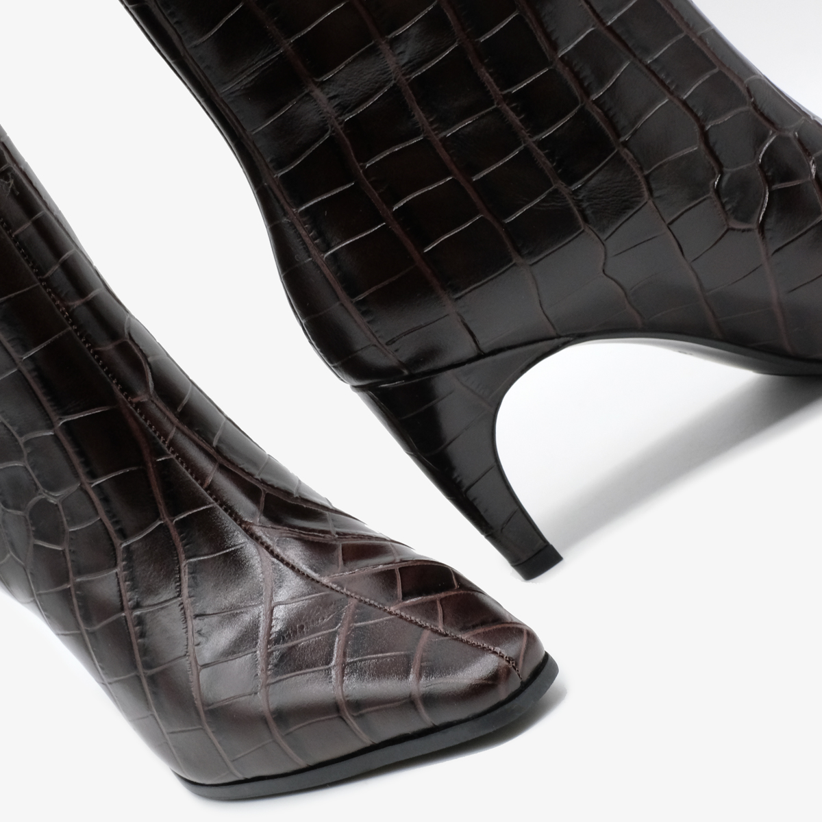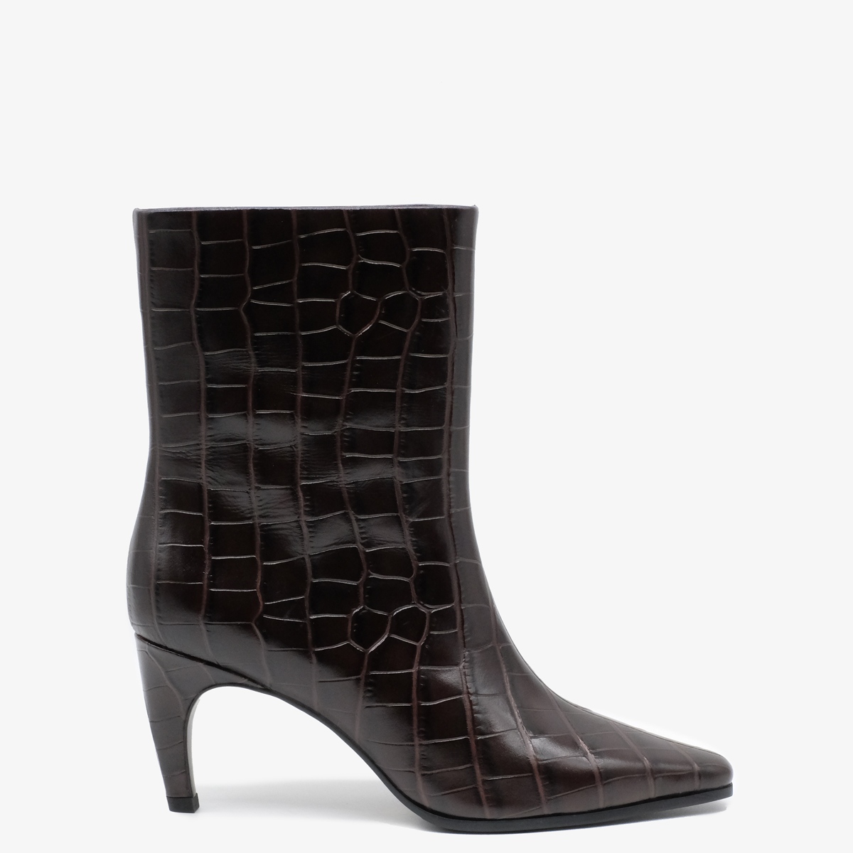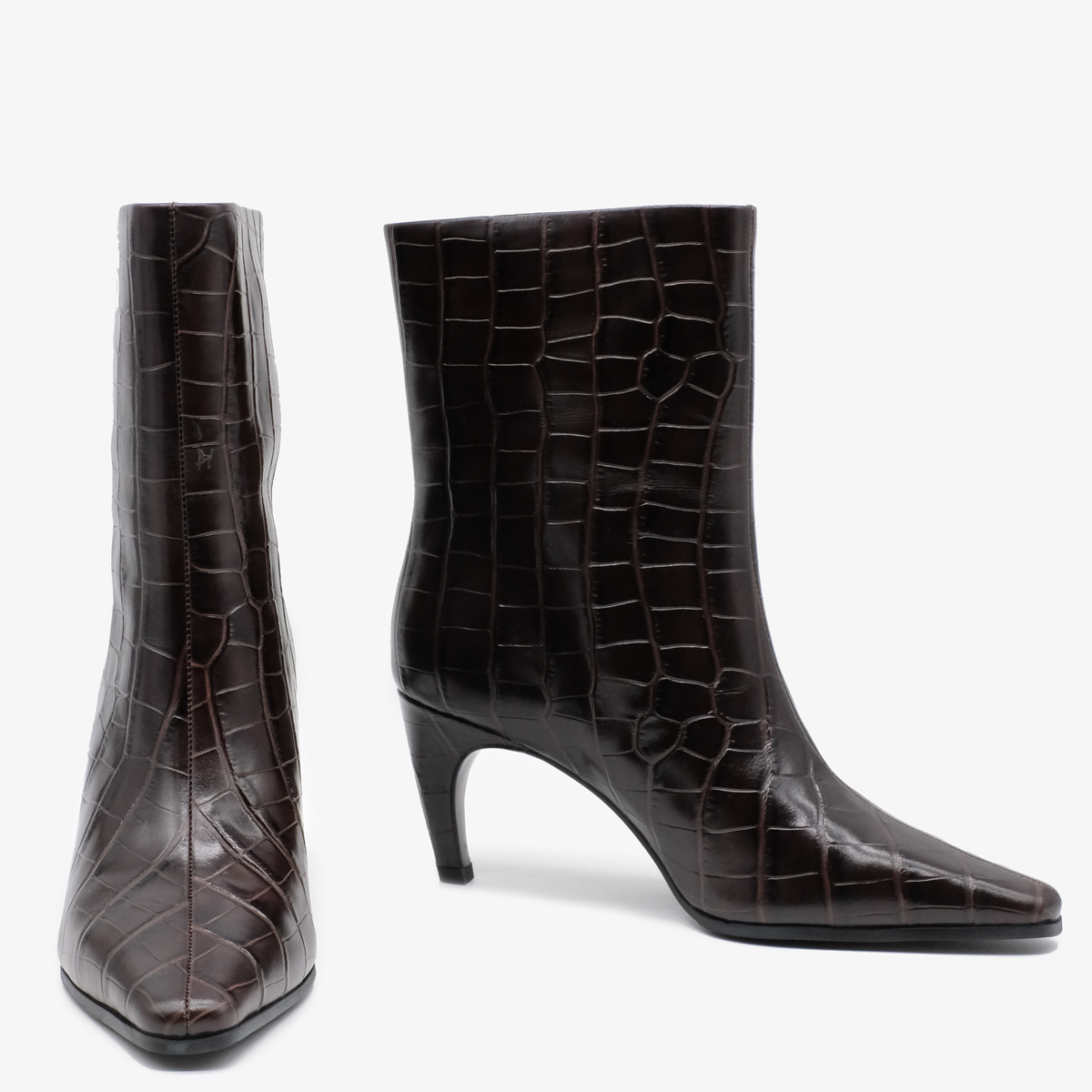 Коричневые ботильоны 11054, выполненные из высококачественной натуральной кожи, станут центральным элементом Вашего образа. Их главная особенность — это эксклюзивная фактура под рептилию в сочетании с изящным острым мысом и устойчивым каблуком, что позволяет создать по-настоящему смелый и уникальный образ. Модель без молнии создает элегантный силуэт, обеспечивая легкое надевание.