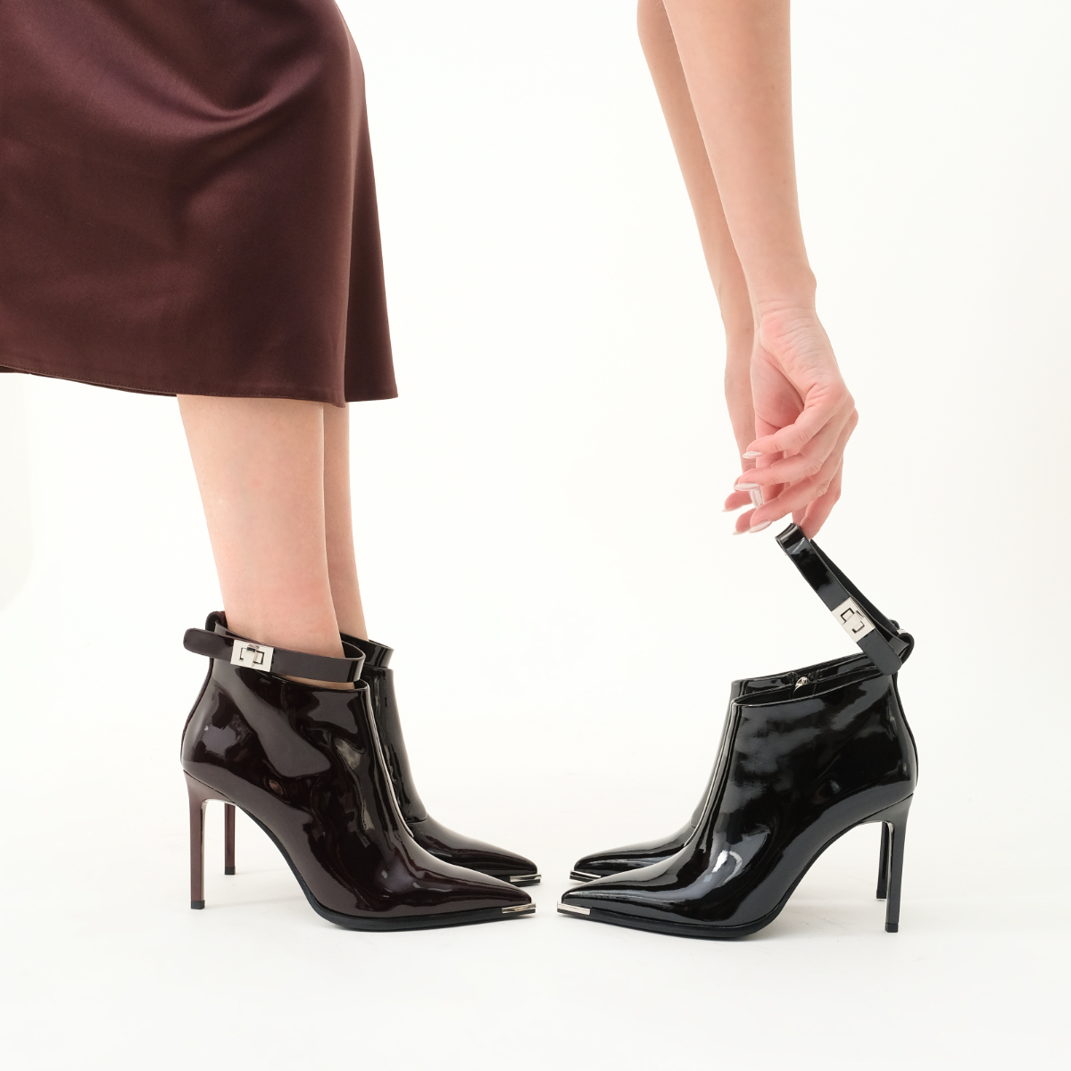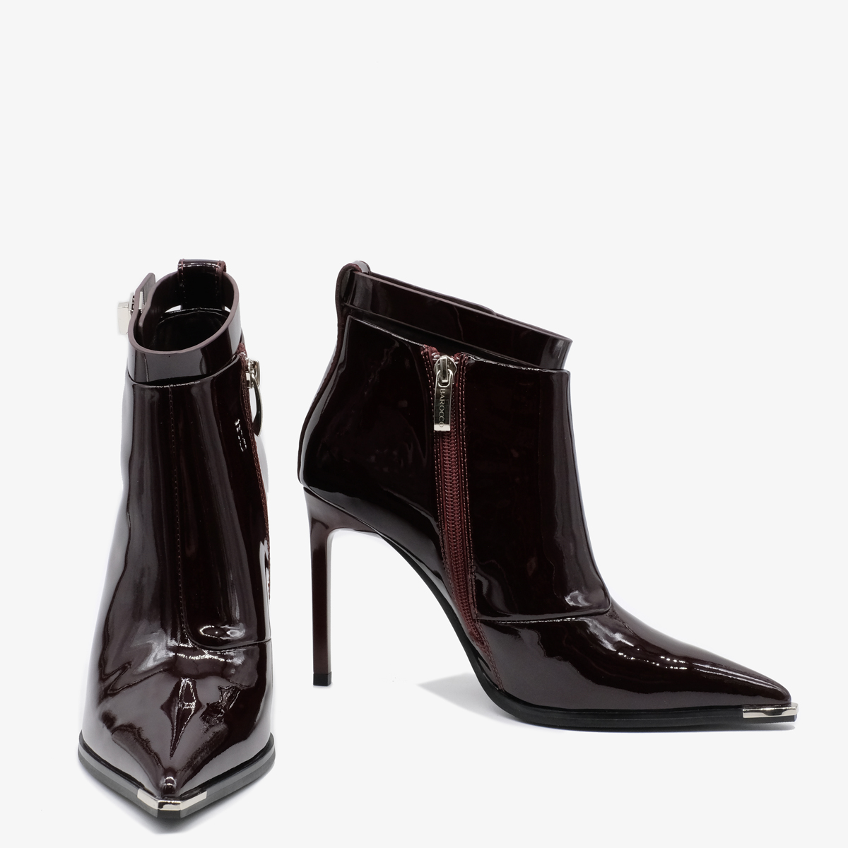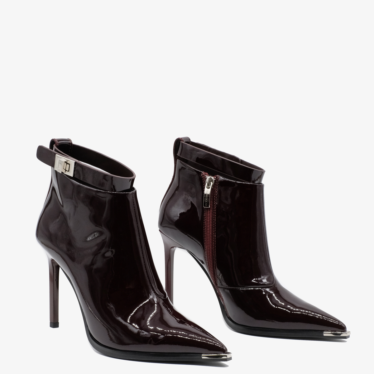 Ботильоны 11058 бордового цвета выполнены из натуральной лакированной кожи, что обеспечивает не только стильный внешний вид, но и долговечность. Устойчивый каблук-шпилька и острый металлический мыс придают ботильонам современный и утонченный вид. Молния с внутренней стороны обеспечивает удобство в обувании, а съемный ремешок позволяет варьировать стиль.