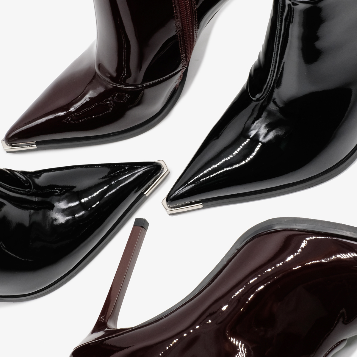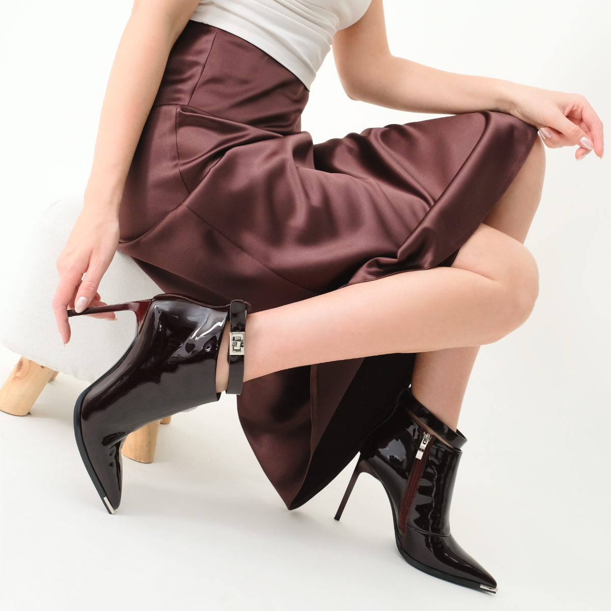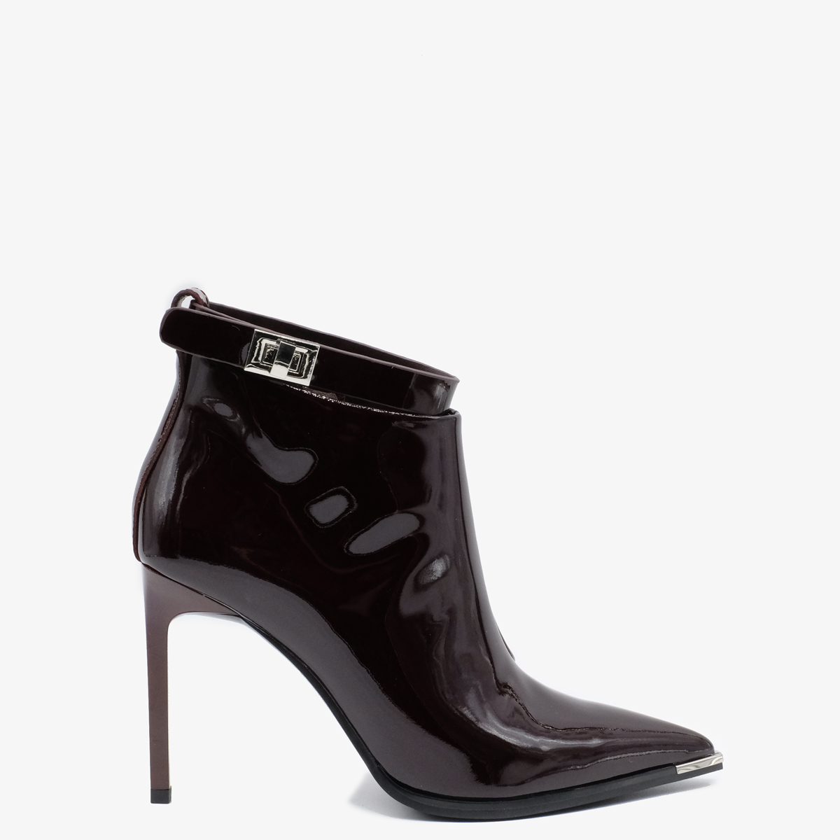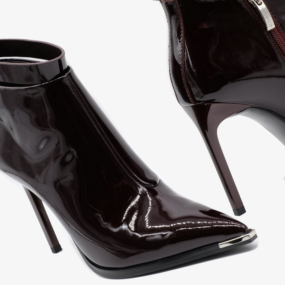 Ботильоны 11058 бордового цвета выполнены из натуральной лакированной кожи, что обеспечивает не только стильный внешний вид, но и долговечность. Устойчивый каблук-шпилька и острый металлический мыс придают ботильонам современный и утонченный вид. Молния с внутренней стороны обеспечивает удобство в обувании, а съемный ремешок позволяет варьировать стиль.