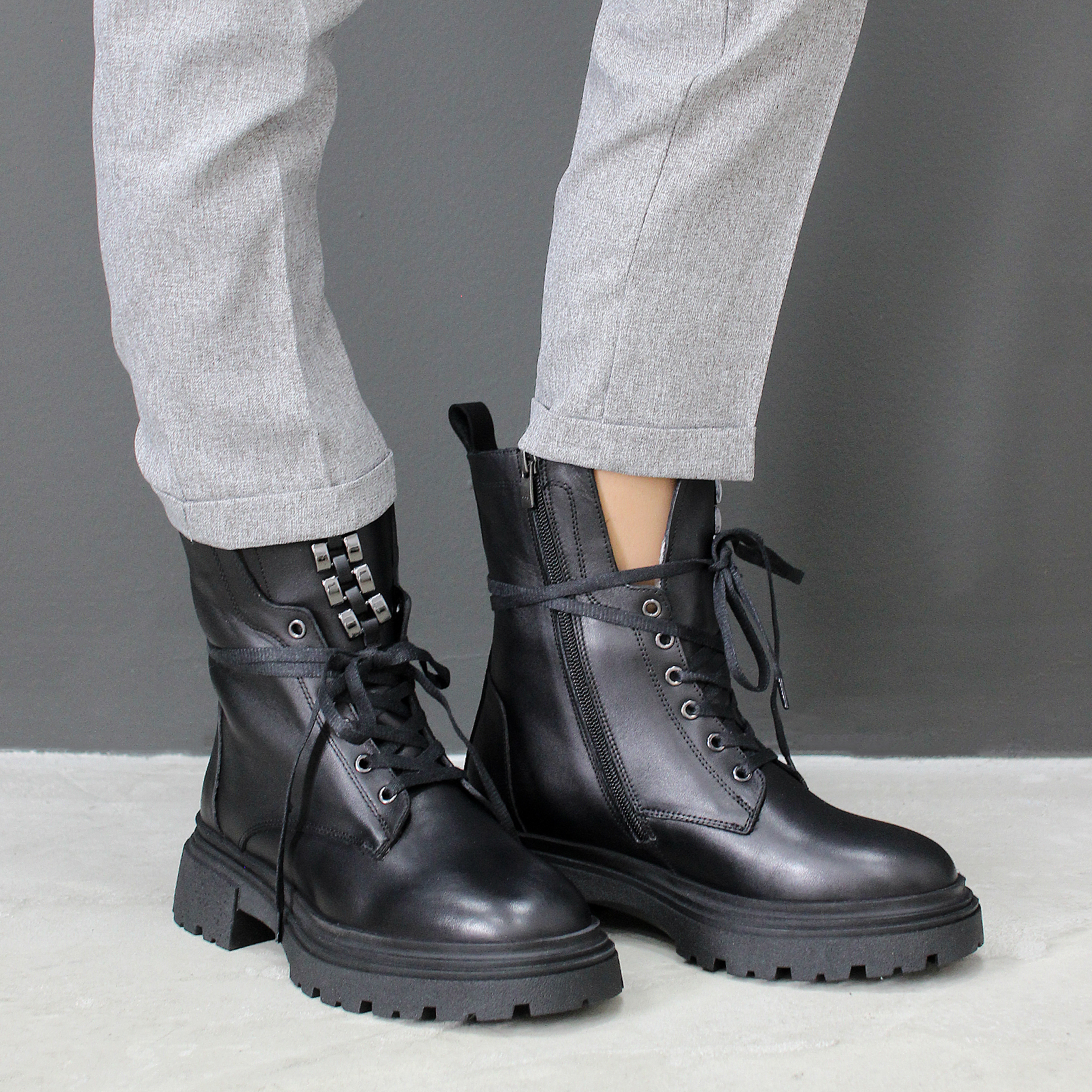 Ключевая особенность: закругленный мыс, шнуровка на подъеме, застежка на молнию, металлический декор на язычке, широкий устойчивый каблук - обеспечивают комфорт и стиль.