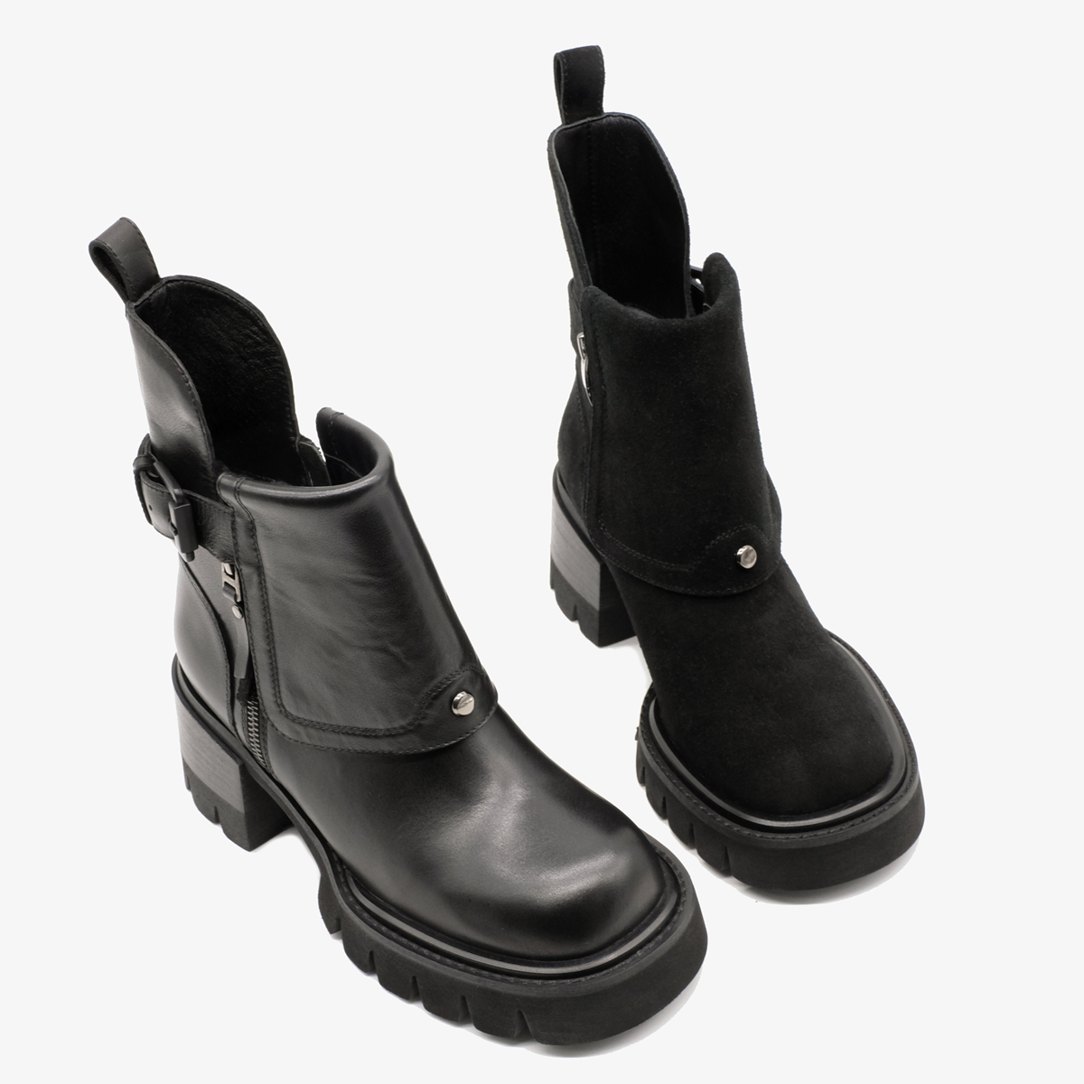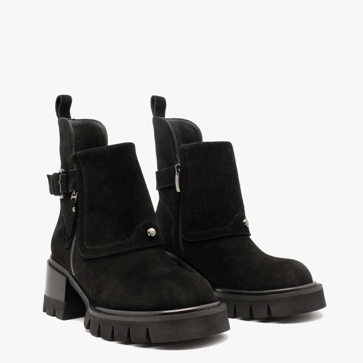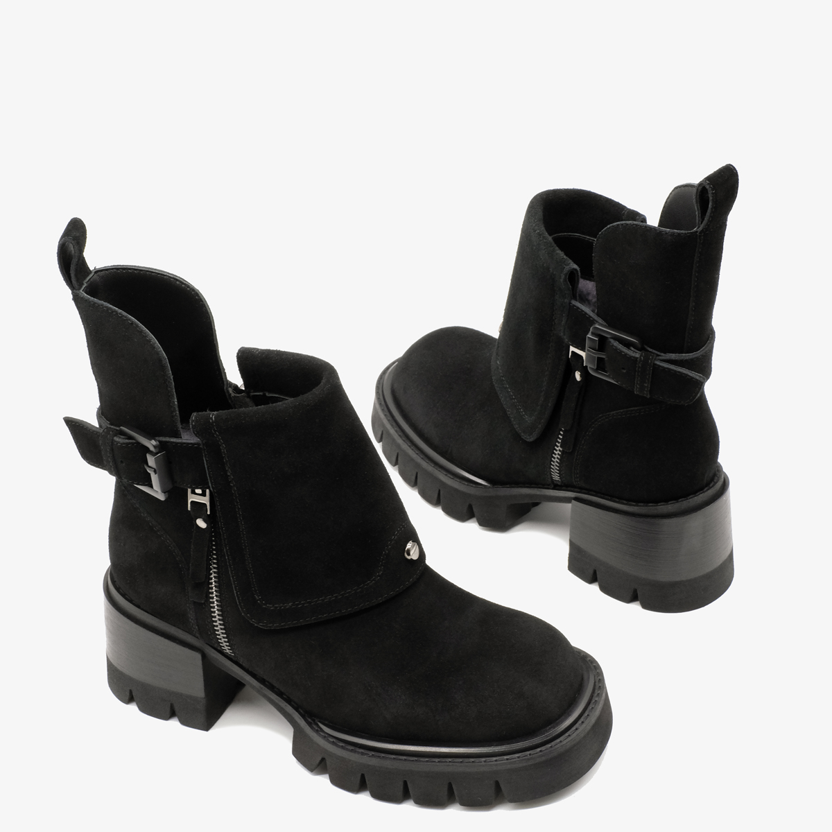 Ботинки 9745,выполненные из натуральной замши черного цвета, — идеальный выбор для стильных и уверенных в себе женщин. Эти ботинки выделяются широким каблуком и закругленным мысом, что обеспечивает не только элегантный вид, но и комфорт при длительной носке. Молнии с обеих сторон делают обувь легкой в использовании. Декор в виде ремешка с пряжкой добавляет индивидуальности и шарма.