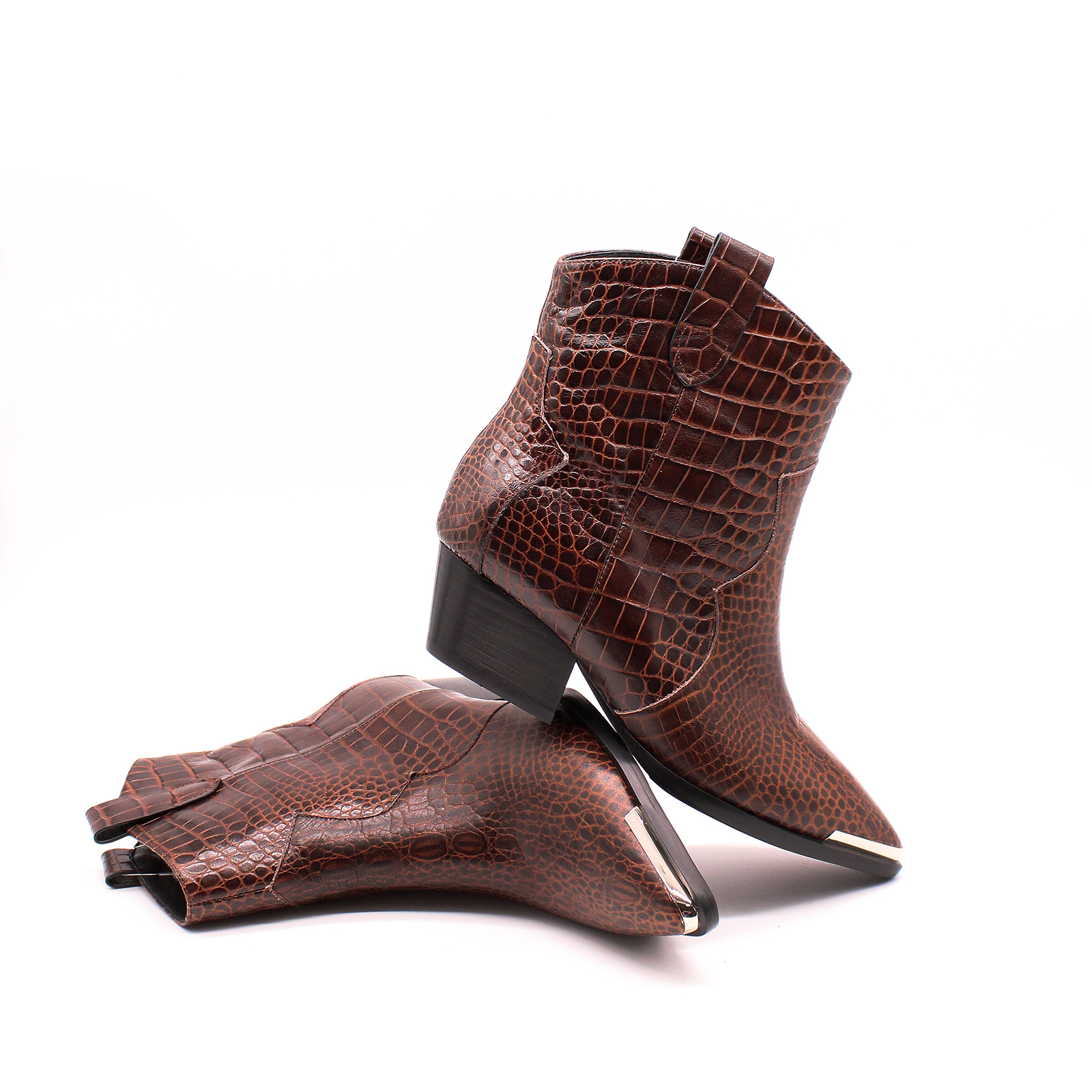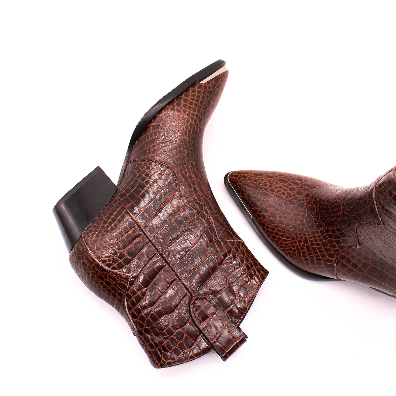 Казаки 9063 коричневого цвета, выполненные из натуральной кожи. Эти ботинки с устойчивым каблуком, заостренными носками, металлическим декором на носке и стильным принтом под рептилию сочетают в себе долговечность и стильный вид.