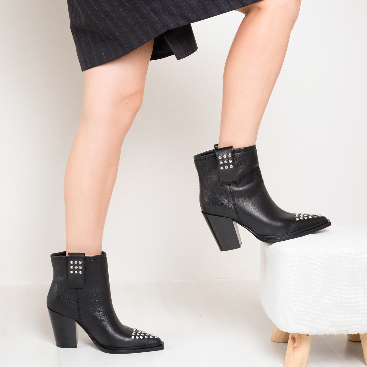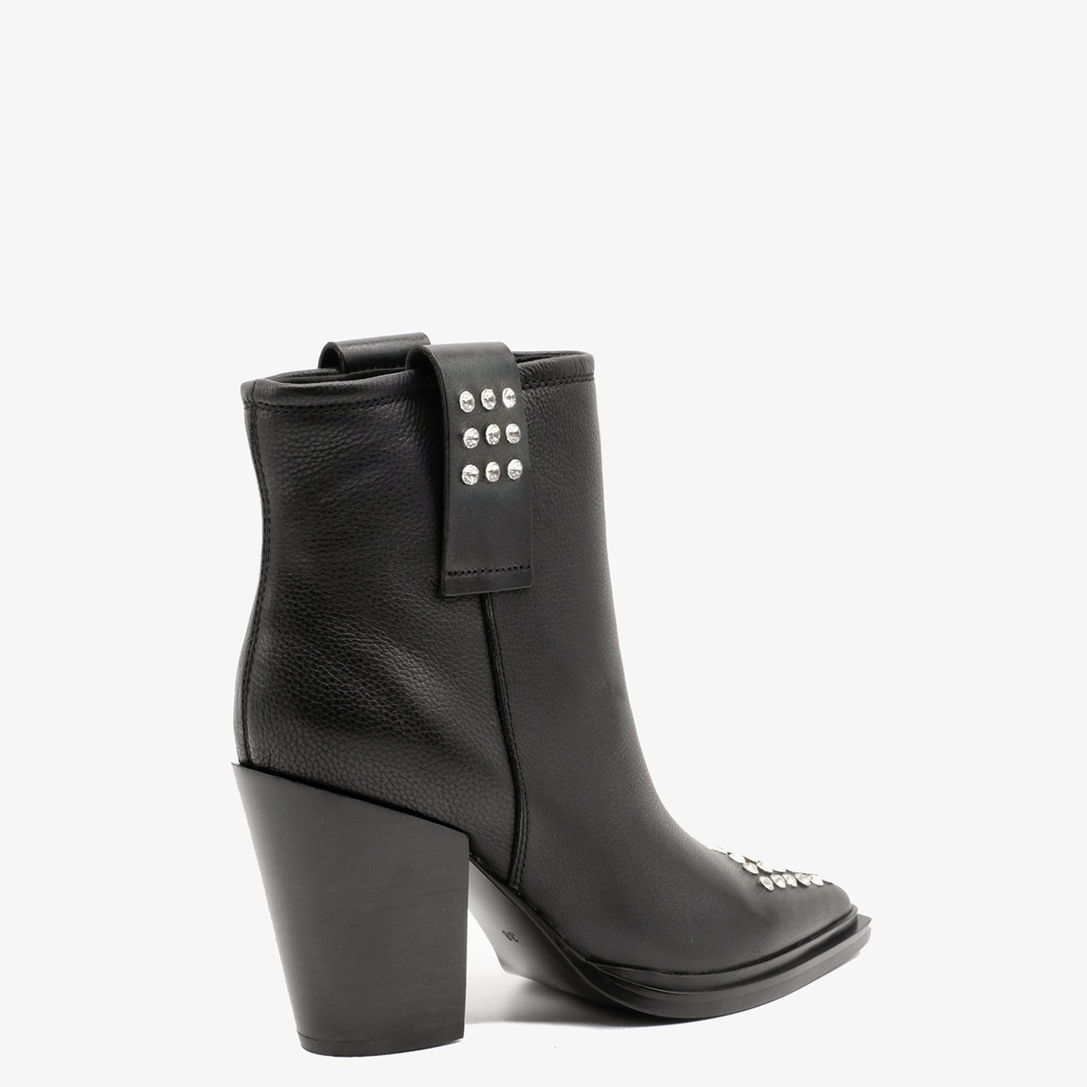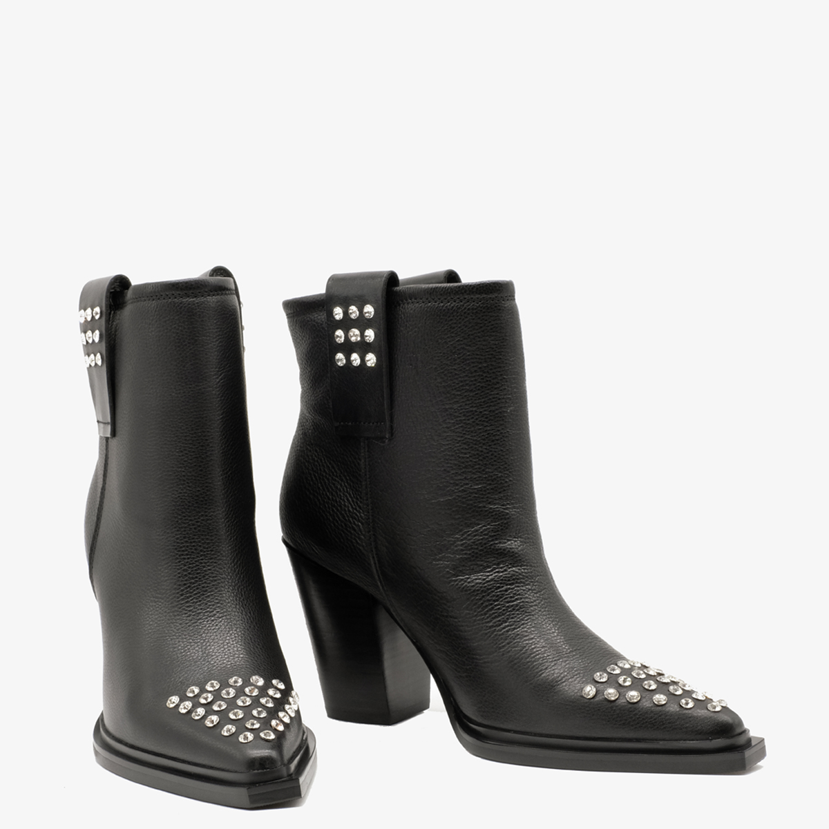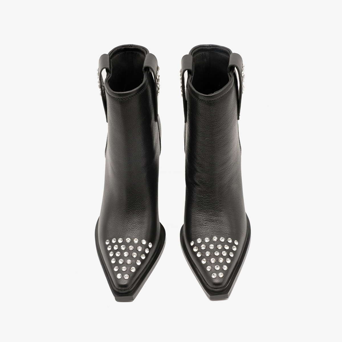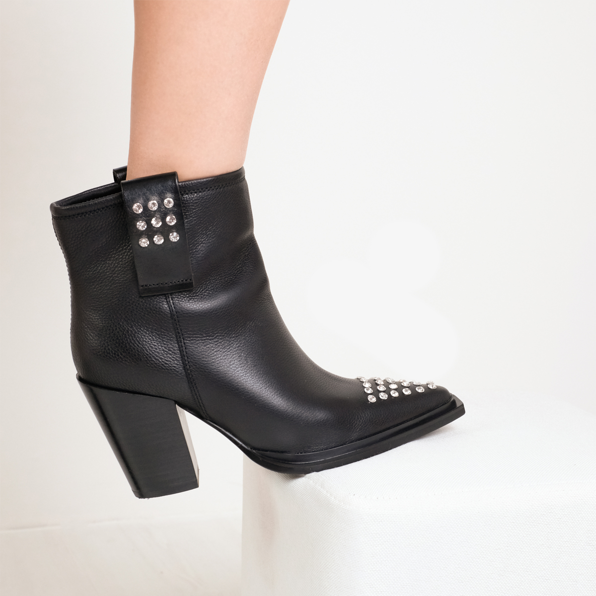 Казаки 9749, выполненные из натуральной кожи черного цвета, станет отличным дополнением к Вашему гардеробу. Эти казаки оснащены широким устойчивым каблуком и острым мысом, что обеспечивает комфорт и уверенность при ходьбе. Отсутствие молнии делает их легкими в использовании, а оформление мыса стразами добавляет нотку изысканности.