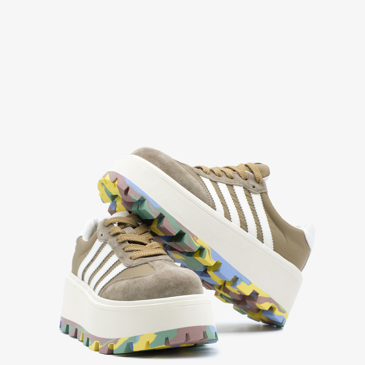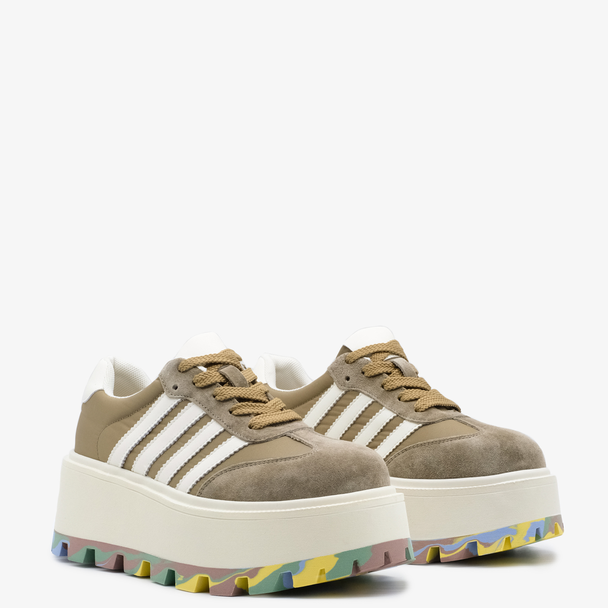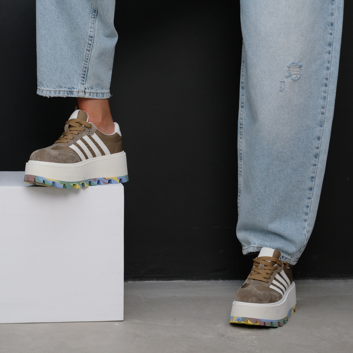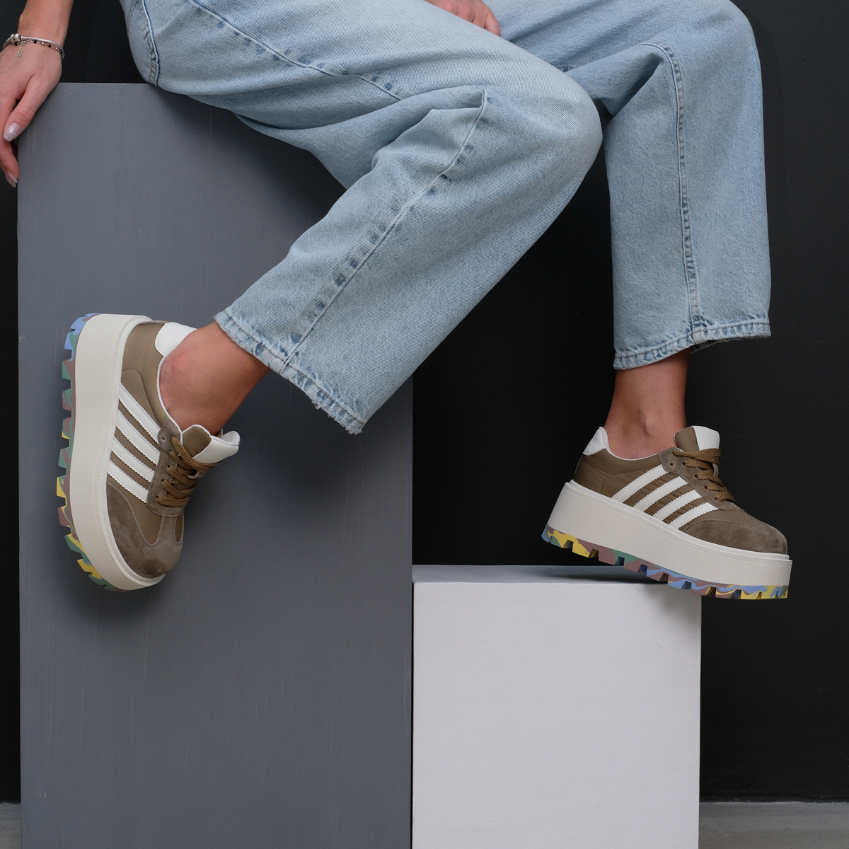 Кеды 10154 цвета хаки выполнены из натуральной кожи и текстиля, что обеспечивает высокое качество и стильный внешний вид. Комфортная высота платформы и закругленный мыс делают эти кеды идеальными для длительной носки, а яркая акцентная подошва добавляет оригинальности и привлекает внимание.