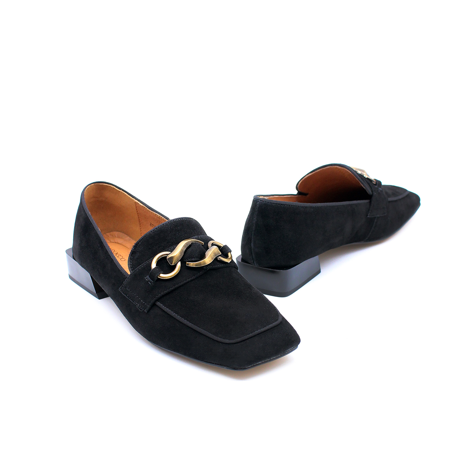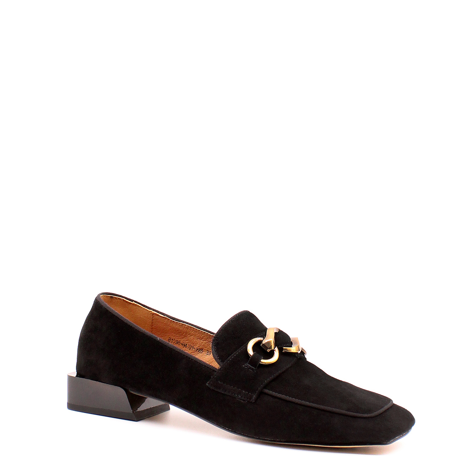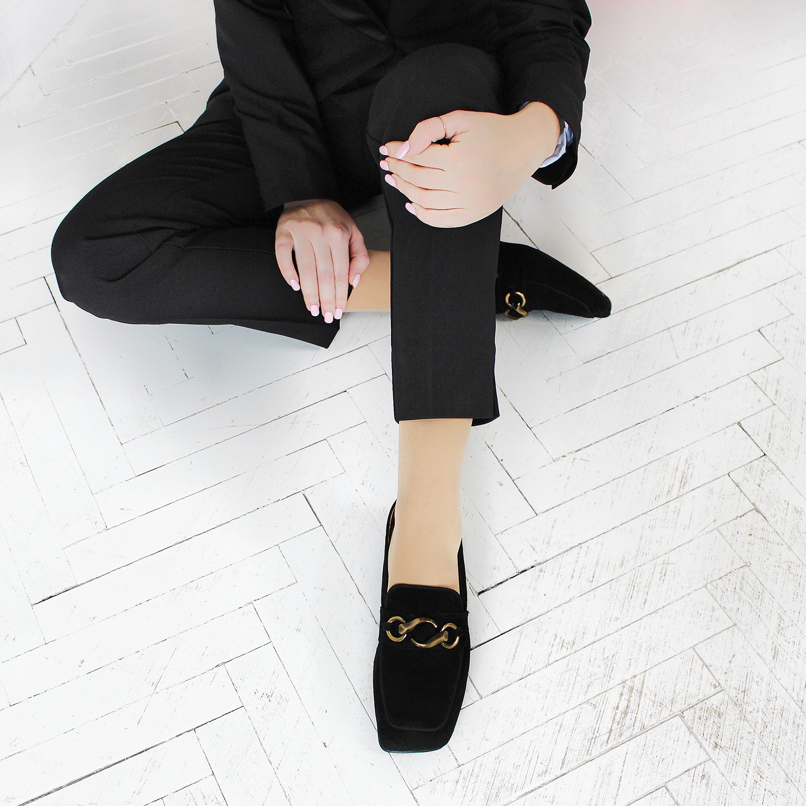 Черные лоферы 8947 изготовлены из высококачественной натуральной замши. Лоферы с устойчивым каблуком, квадратным носком и металлическим декором в виде пряжки спереди обеспечат комфорт и изысканность.