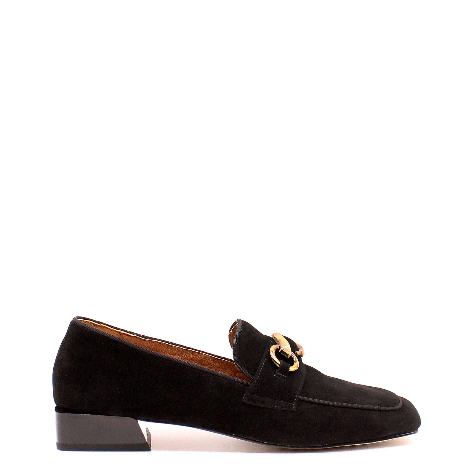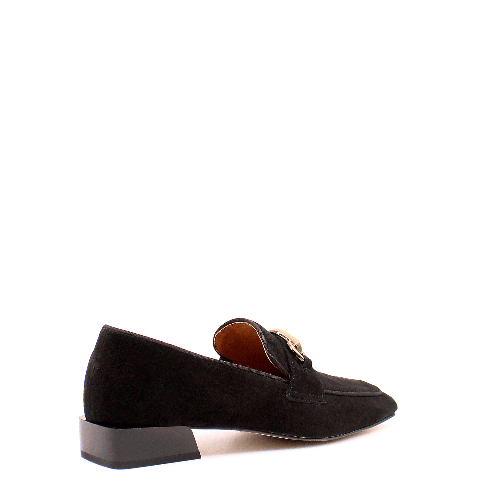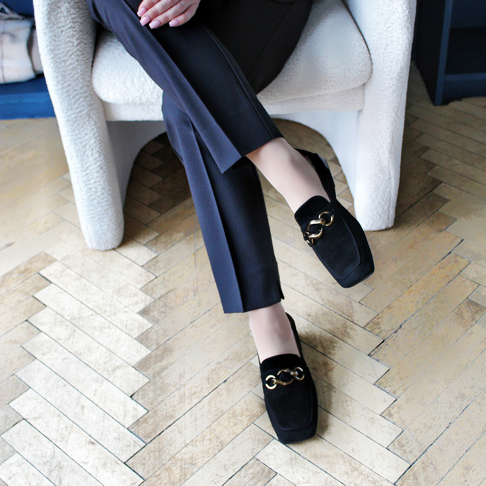 Черные лоферы 8947 изготовлены из высококачественной натуральной замши. Лоферы с устойчивым каблуком, квадратным носком и металлическим декором в виде пряжки спереди обеспечат комфорт и изысканность.