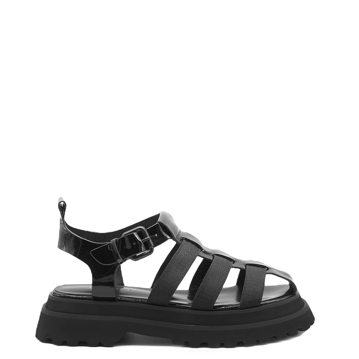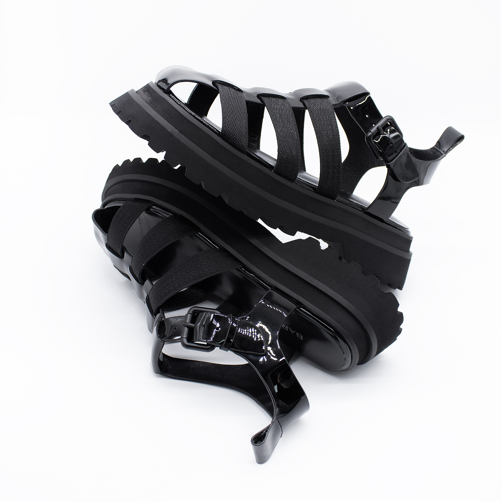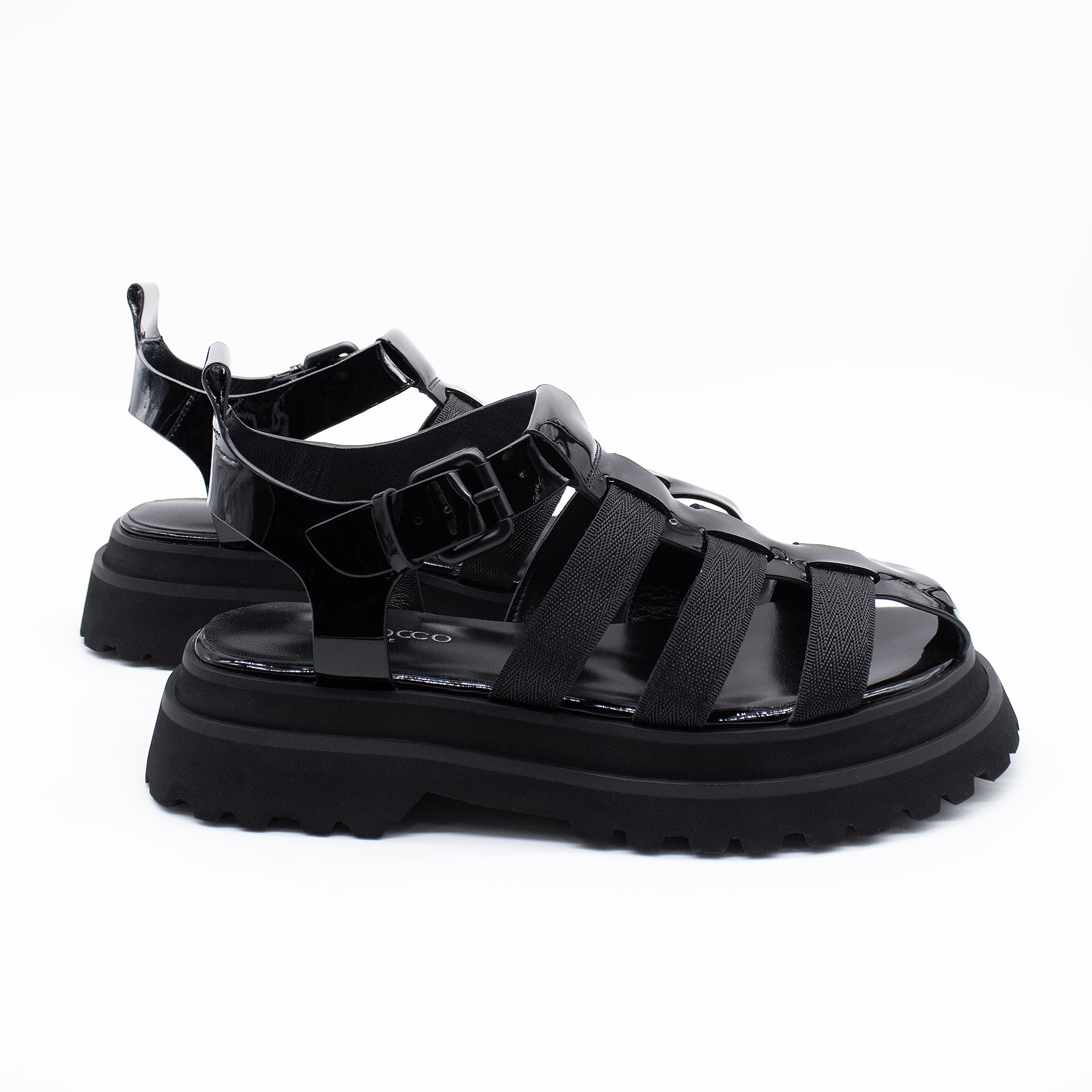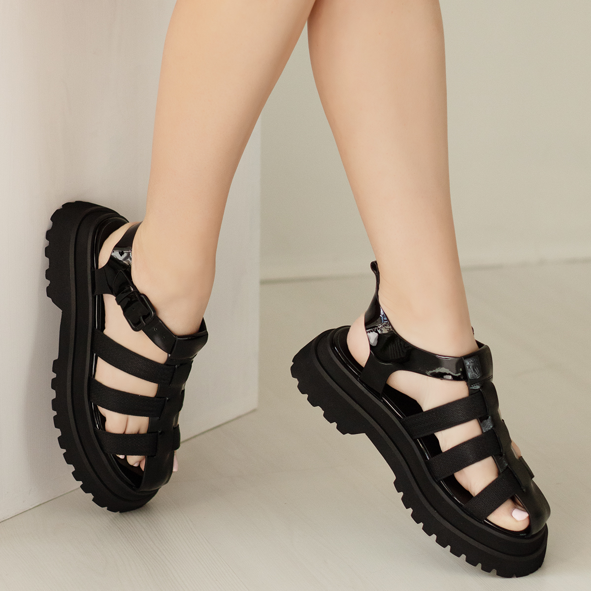 Сандалии с высотой подошвы 4,5 см оснащены прочной подошвой из полимера ТЭП, обеспечивающей длительный срок службы. Стелька из натуральной кожи и внутренняя подкладка обеспечивают оптимальный комфорт при каждом шаге, а верх гармонично сочетает лакированную кожу с текстилем, создавая шикарный и современный вид.