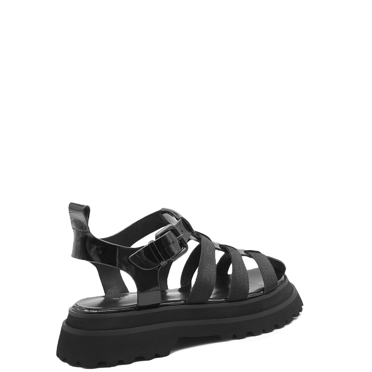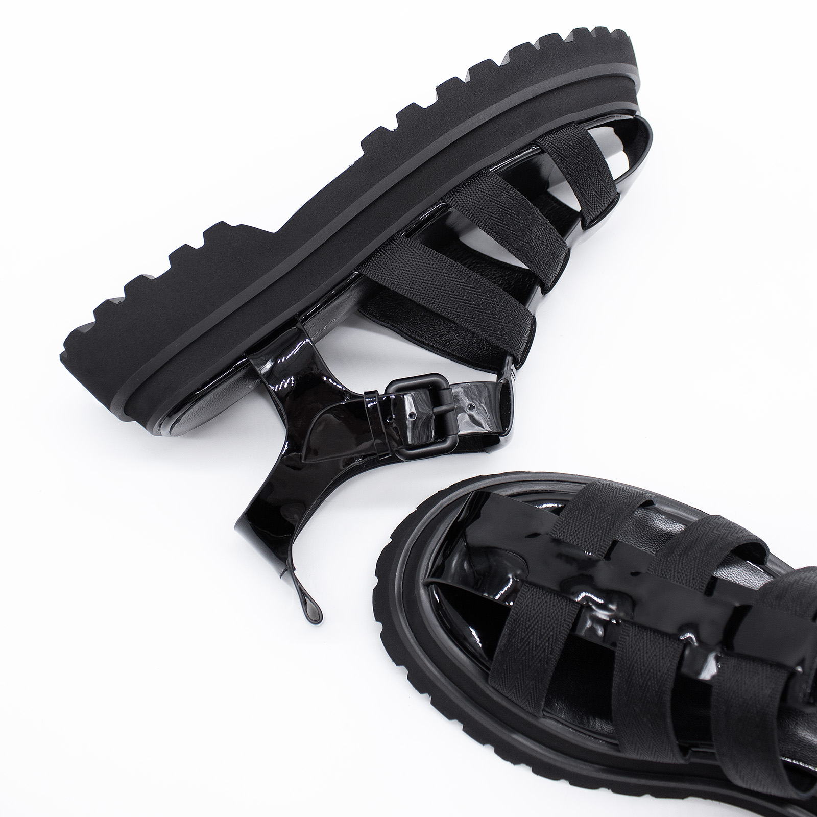 Сандалии 9276, выполненные из натуральной лакированный кожи в сочетании с высококачественным текстилем в черном цвете, — стильный и универсальный выбор для Вашей коллекции обуви. Эти сандалии имеют удобную платформу, закругленный носок, открытую пятку и надежный ремешок с пряжкой для дополнительного удобства.