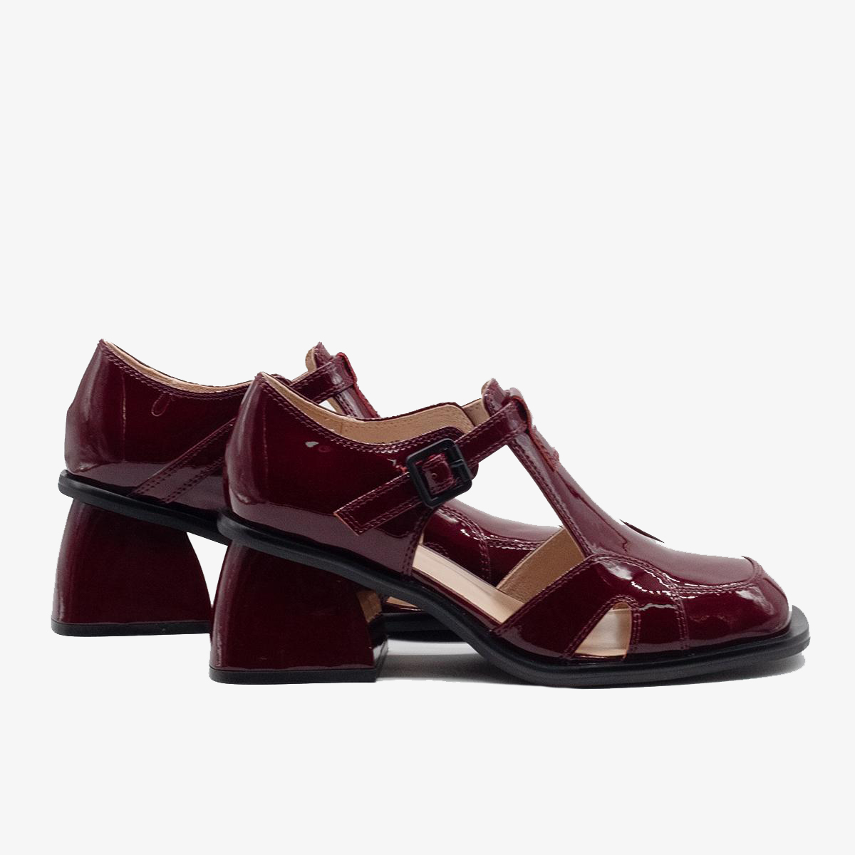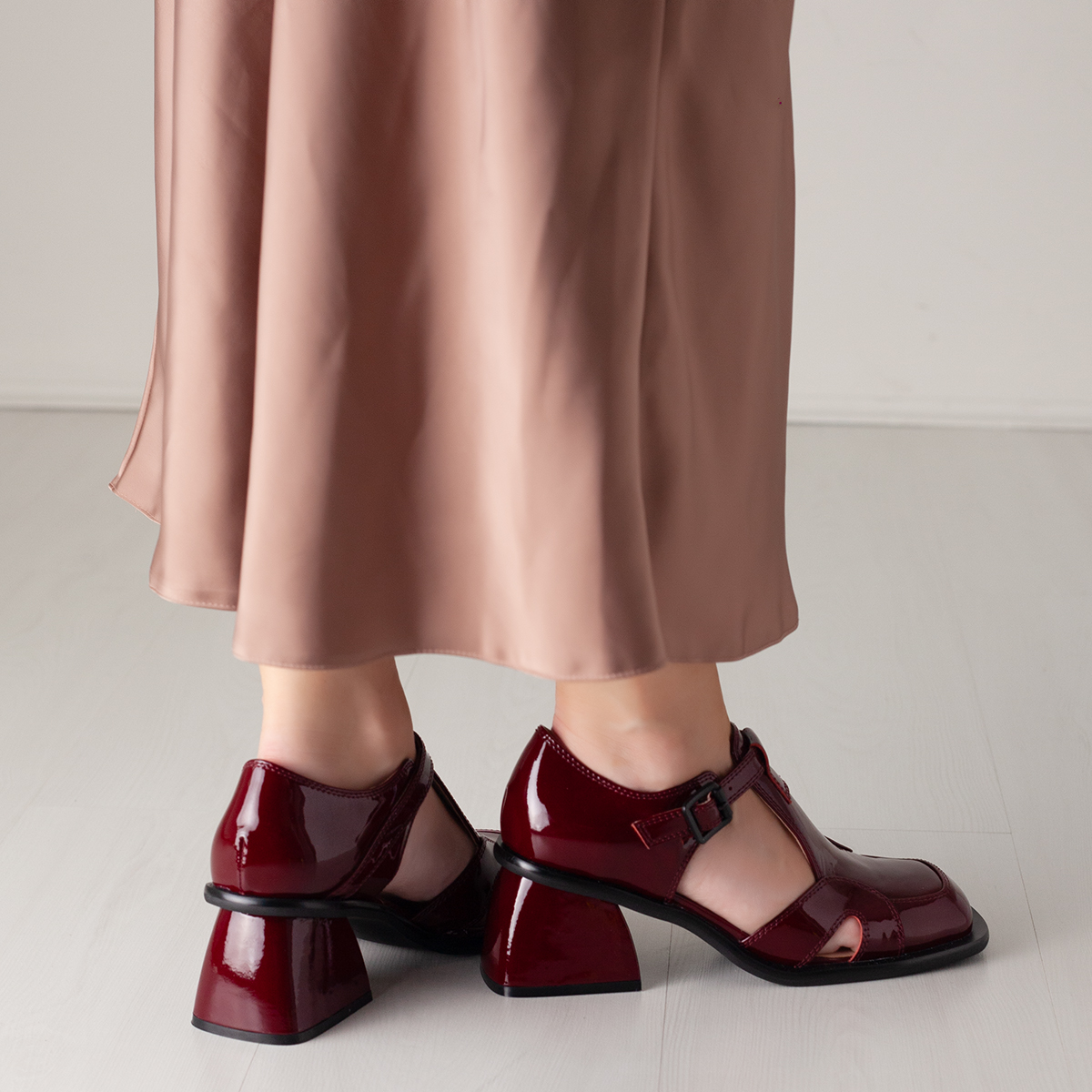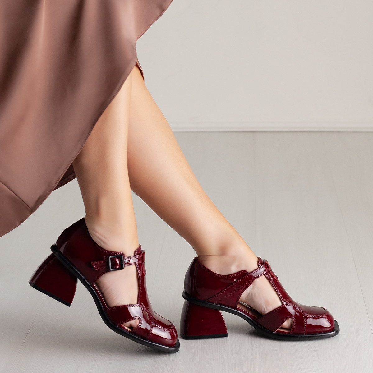 Туфли 9449 из натуральной лакированной кожи бордового цвета - стильный выбор для модных женщин. Ключевая особенность этих туфель - широкий устойчивый каблук (каблук обтянут натуральной лакированной кожей), прямоугольный мыс, застежка на ремешок с пряжкой на подъеме, стиль Мэри Джейн, что придает удобство и изысканность Вашему образу.